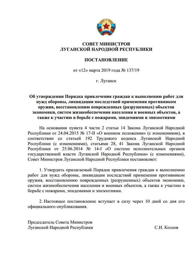 13.03.2019 | (3102 id = 1875 СМИ) "Для нужд обороны": оккупационные власти "ЛНР" ввели для гражданского населения трудовую повинность. ДОКУМЕНТ | censor.net.ua | 12:39:06