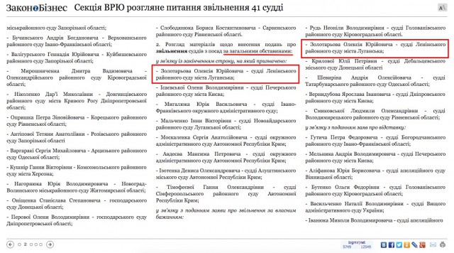 "Сегодня я хочу показать вам еще одного персонажа, судью Ленинского районного суда города Луганска Золотарева Алексея Юрьевича, который уже через 4 дня, 25 января, попытается уволиться с должности судьи на общих основаниях - по собственному желанию. Если данное решение будет принято, то впоследствии Золотарев сможет спокойно получать пенсию украинского судьи, а она существенно выше пенсии учительницы или врача, которые являются заложниками террористов "ЛНР" и не имеют возможностей для того, чтобы покинуть зону оккупации", - отмечает Иванов.