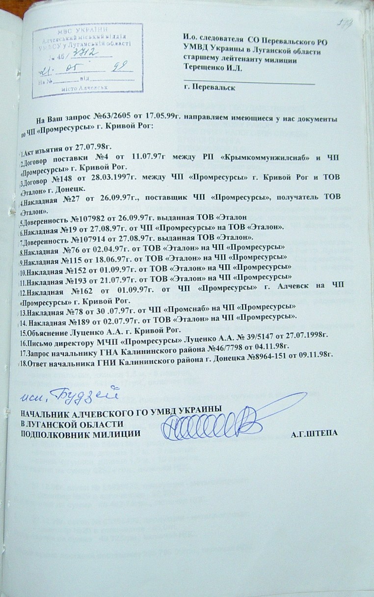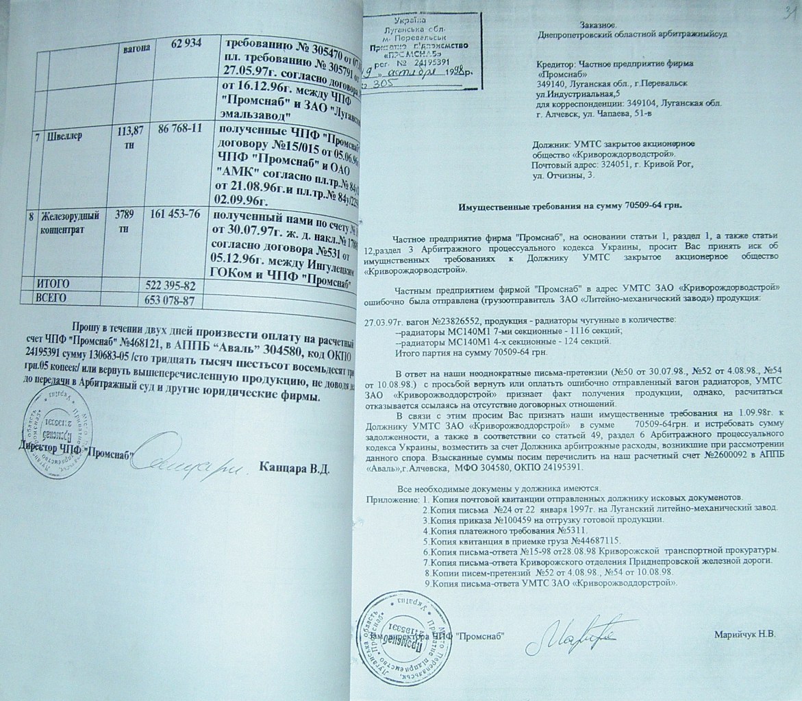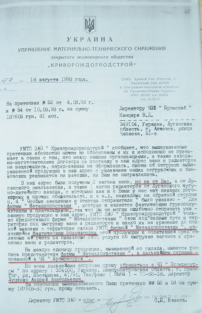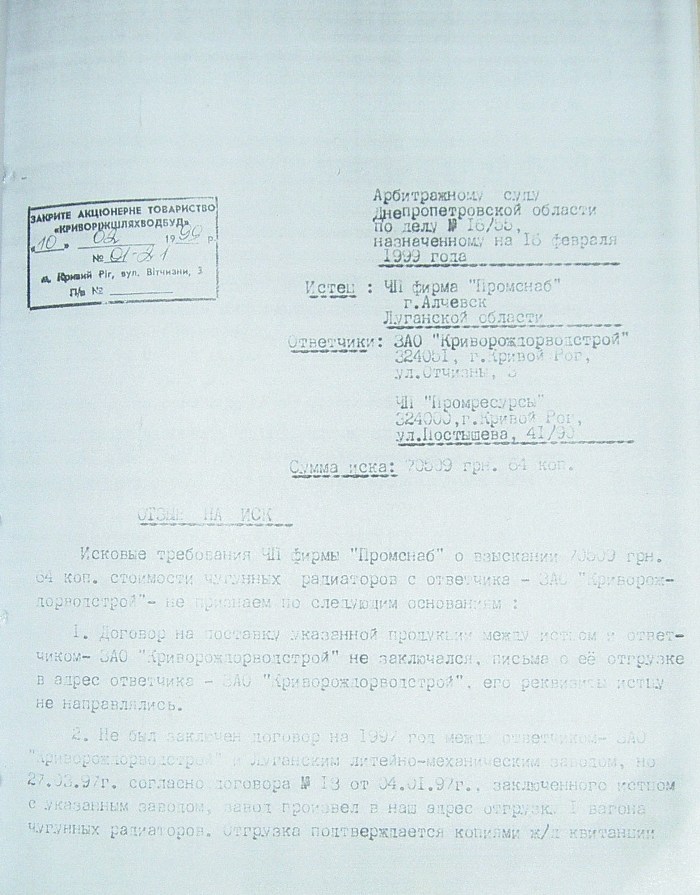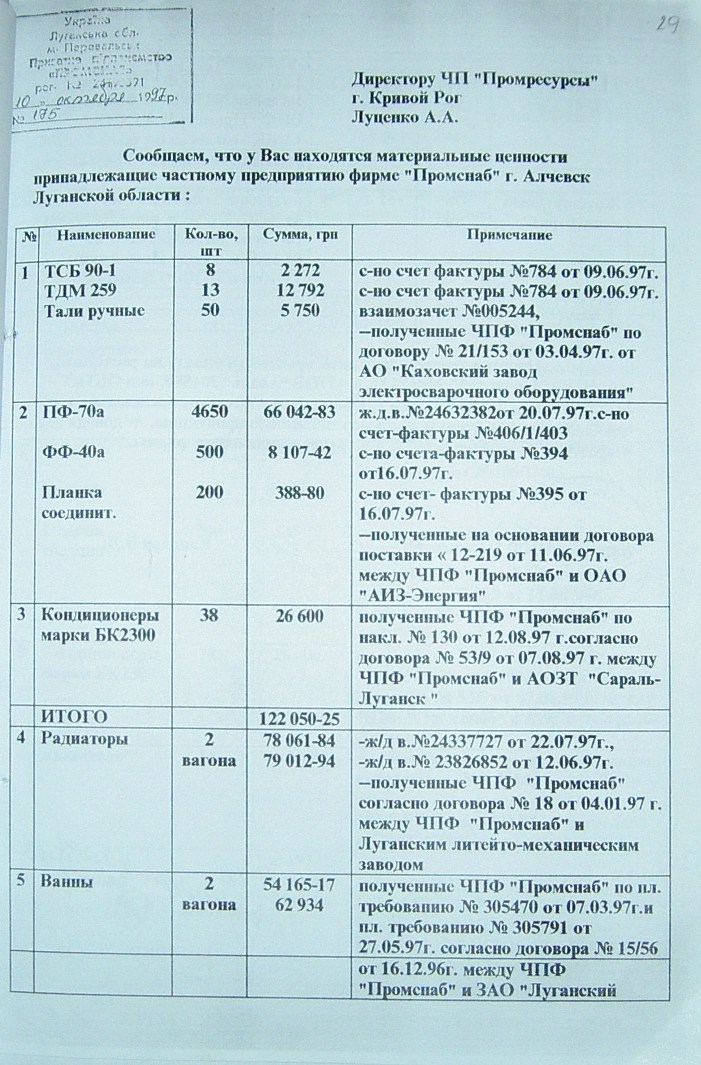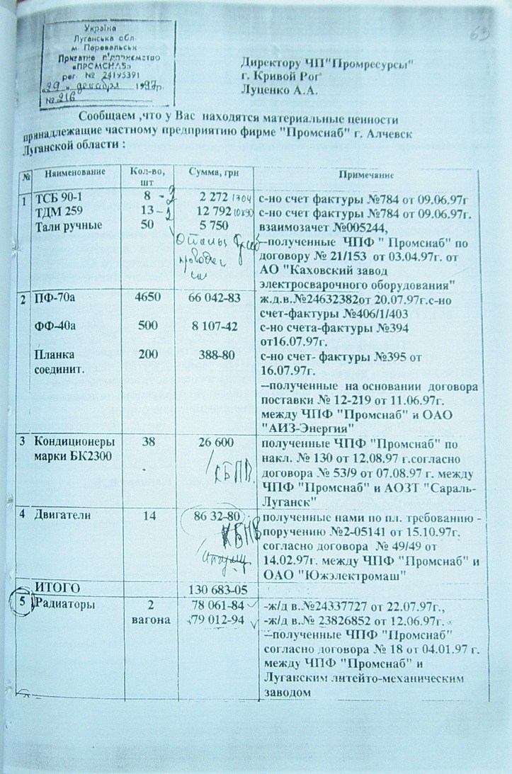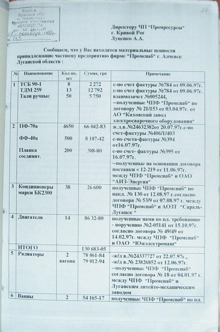 На стр. 18 т.№4 уголовного дела №27/99/0449 находится решение арбитражного суда Днепропетровской области от 11.05.2000г. (324 Страница 42), которым установлено, что «Луценко А.А. не является субъектом предпринимательской деятельности и получил радиаторы не как представитель ЧП «Промресурсы» г.Кривой Рог, а как физическое лицо…», что не соответствует многочисленным документом по незаконному оприходованию гр-ном Луценко продукции ЧПФ «Промснаб» на его ЧП «Промресурсы» г.Кривой Рог (3635). При этом судья Бахмат проигнорировала многочисленные расписки о получении ТМЦ, как представителем ЧП "Промресурсы" г.Кривой Рог (1587 фото материалов уголовного дела). Квитанции железнодорожных вагонов (324 Страница 44-45) другие документы, подтверждающие поставку радиаторов и их принадлежность. (324 Страница 49). Файлы из папки 1_JPG/ugdelluc.
