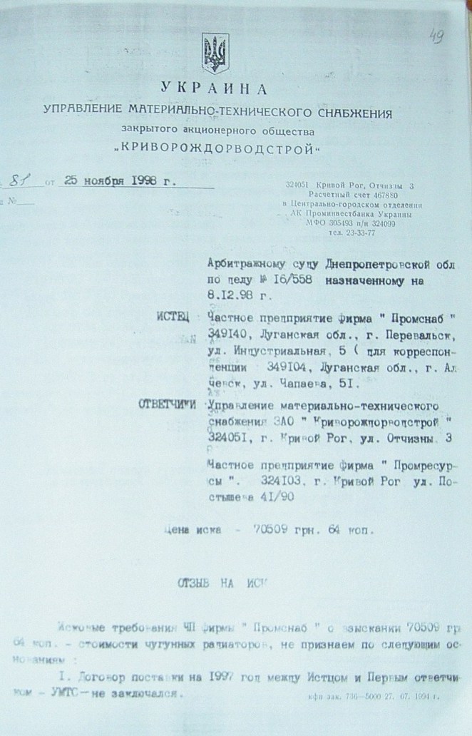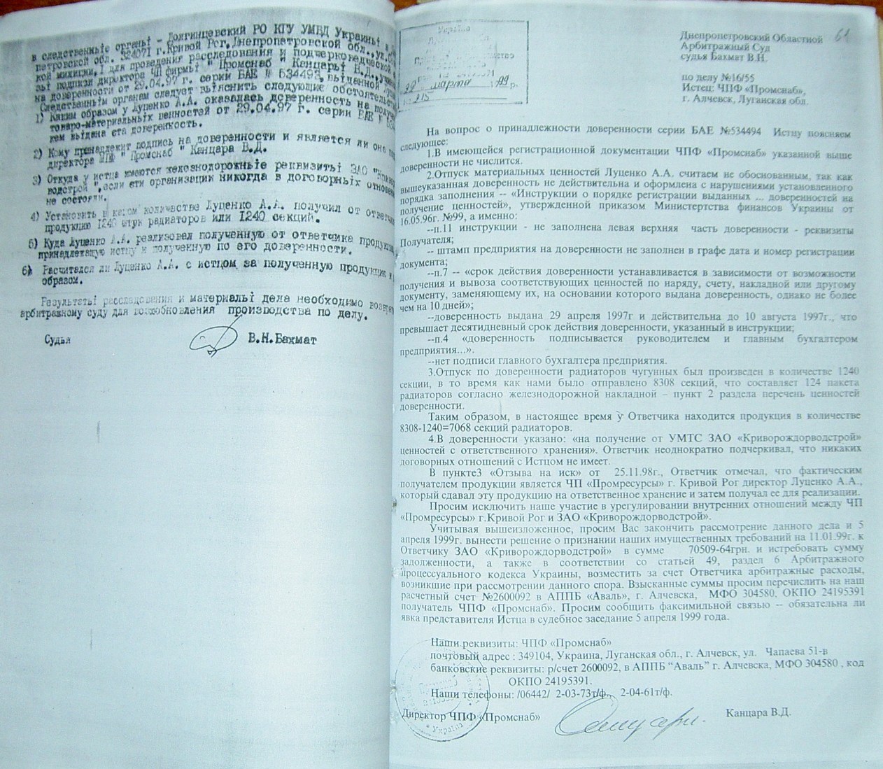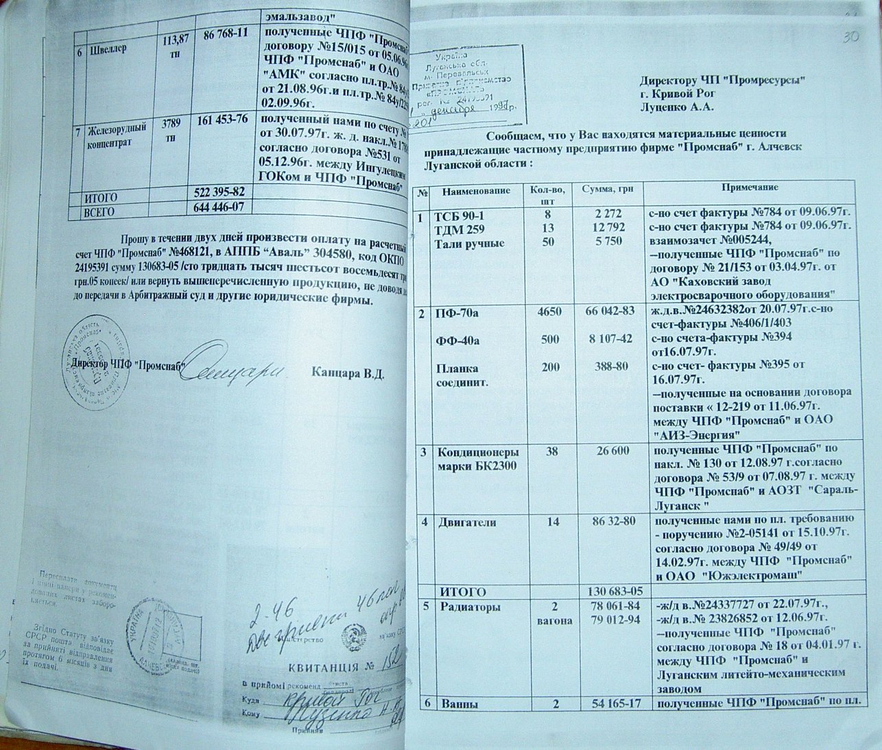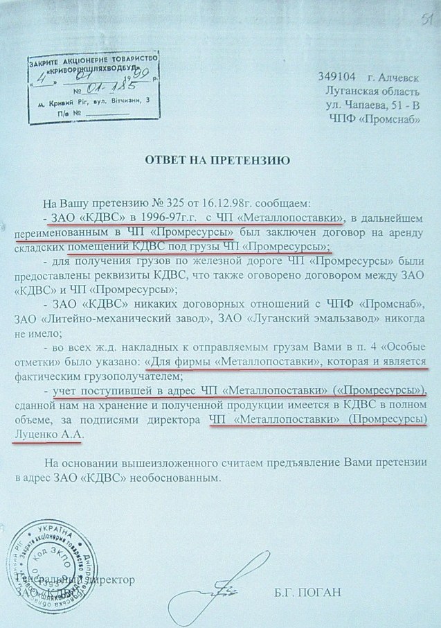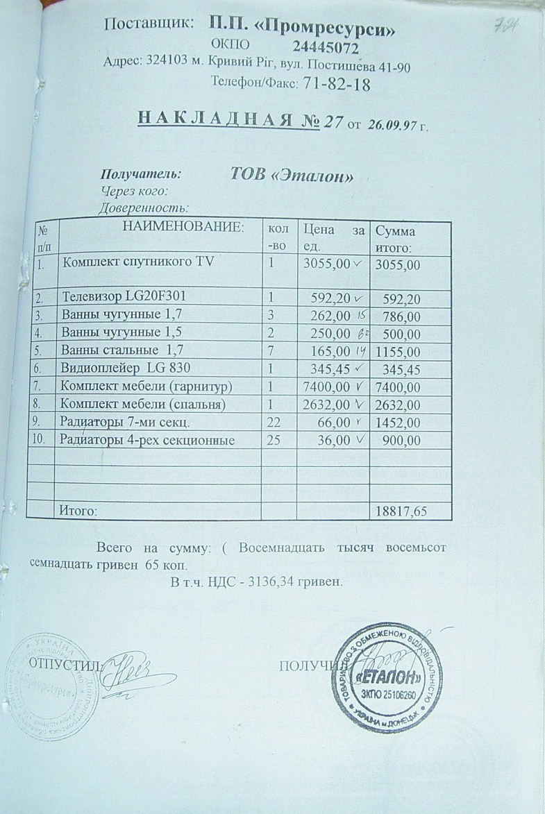На стр. 18 т.№4 уголовного дела №27/99/0449 находится решение арбитражного суда Днепропетровской области от 11.05.2000г. (324 Страница 42), которым установлено, что «Луценко А.А. не является субъектом предпринимательской деятельности и получил радиаторы не как представитель ЧП «Промресурсы» г.Кривой Рог, а как физическое лицо…», что не соответствует многочисленным документом по незаконному оприходованию гр-ном Луценко продукции ЧПФ «Промснаб» на его ЧП «Промресурсы» г.Кривой Рог (3635). При этом судья Бахмат проигнорировала многочисленные расписки о получении ТМЦ, как представителем ЧП "Промресурсы" г.Кривой Рог (1587 фото материалов уголовного дела). Квитанции железнодорожных вагонов (324 Страница 44-45) другие документы, подтверждающие поставку радиаторов и их принадлежность. (324 Страница 49). Файлы из папки 1_JPG/ugdelluc.