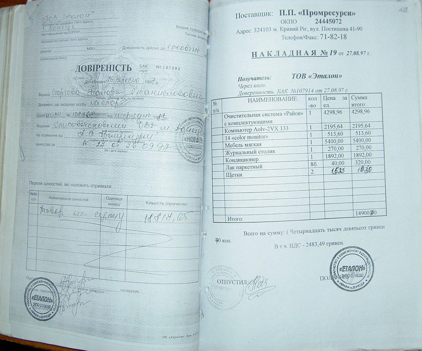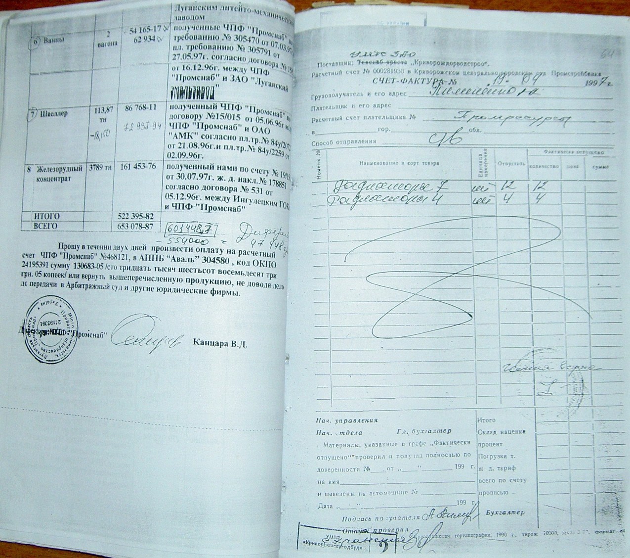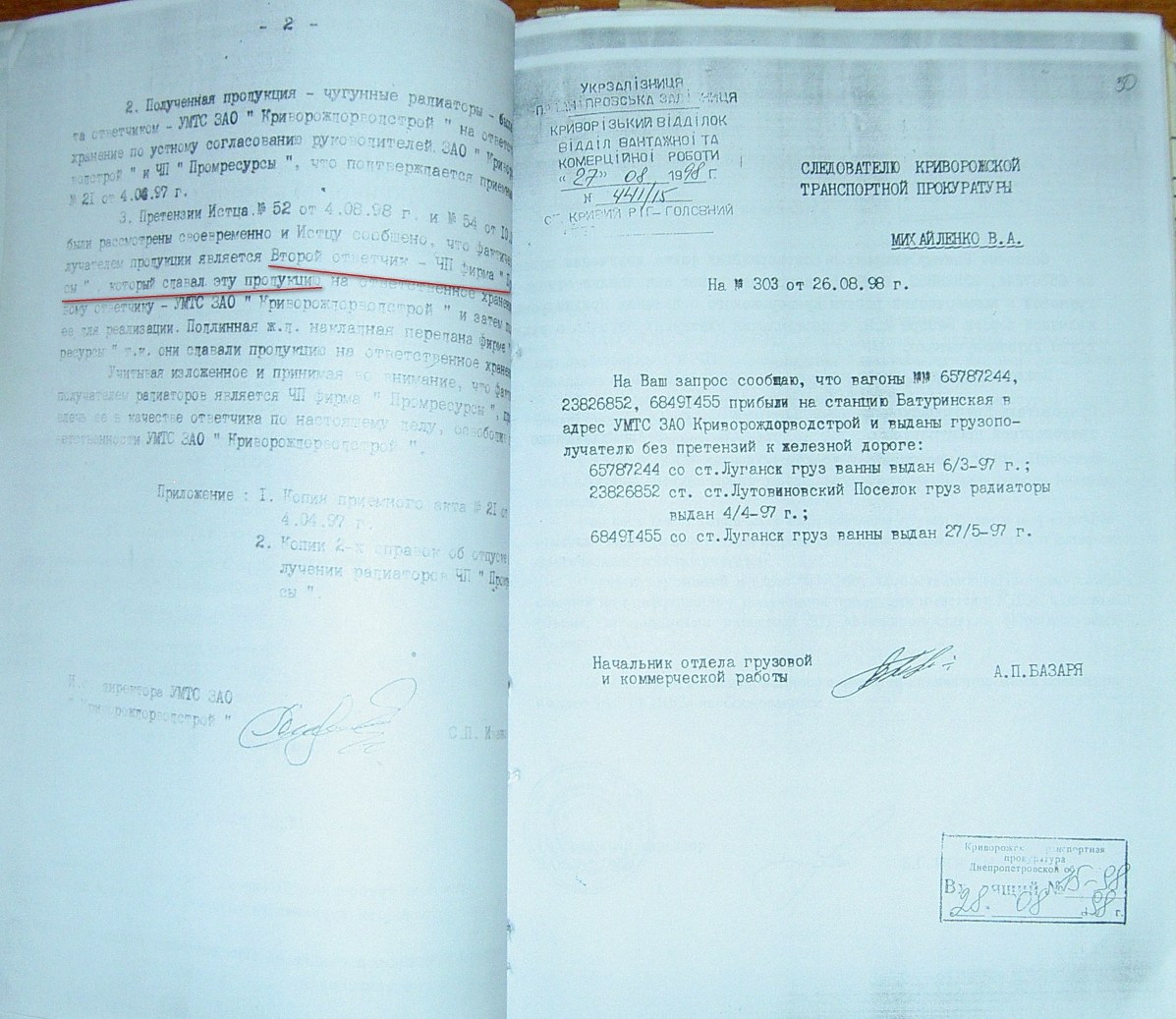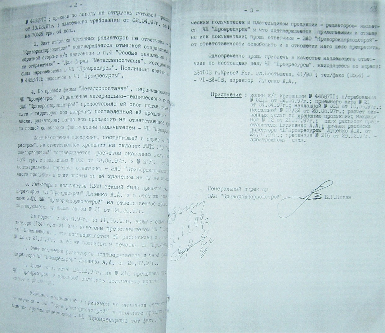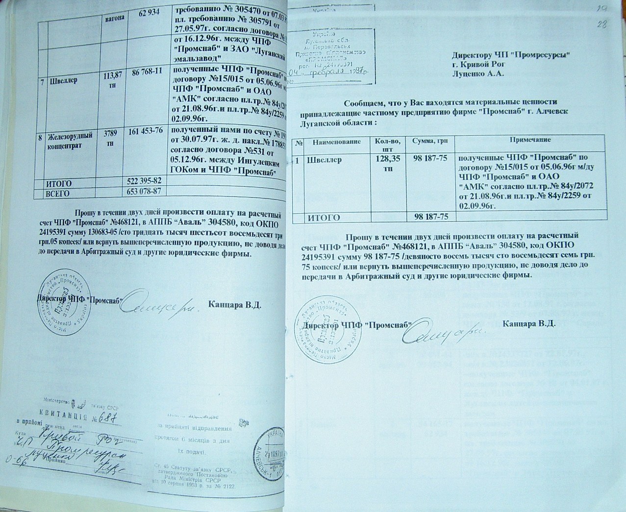 На стр. 18 т.№4 уголовного дела №27/99/0449 находится решение арбитражного суда Днепропетровской области от 11.05.2000г. (324 Страница 42), которым установлено, что «Луценко А.А. не является субъектом предпринимательской деятельности и получил радиаторы не как представитель ЧП «Промресурсы» г.Кривой Рог, а как физическое лицо…», что не соответствует многочисленным документом по незаконному оприходованию гр-ном Луценко продукции ЧПФ «Промснаб» на его ЧП «Промресурсы» г.Кривой Рог (3635). При этом судья Бахмат проигнорировала многочисленные расписки о получении ТМЦ, как представителем ЧП "Промресурсы" г.Кривой Рог (1587 фото материалов уголовного дела). Квитанции железнодорожных вагонов (324 Страница 44-45) другие документы, подтверждающие поставку радиаторов и их принадлежность. (324 Страница 49). Файлы из папки 1_JPG/ugdelluc.