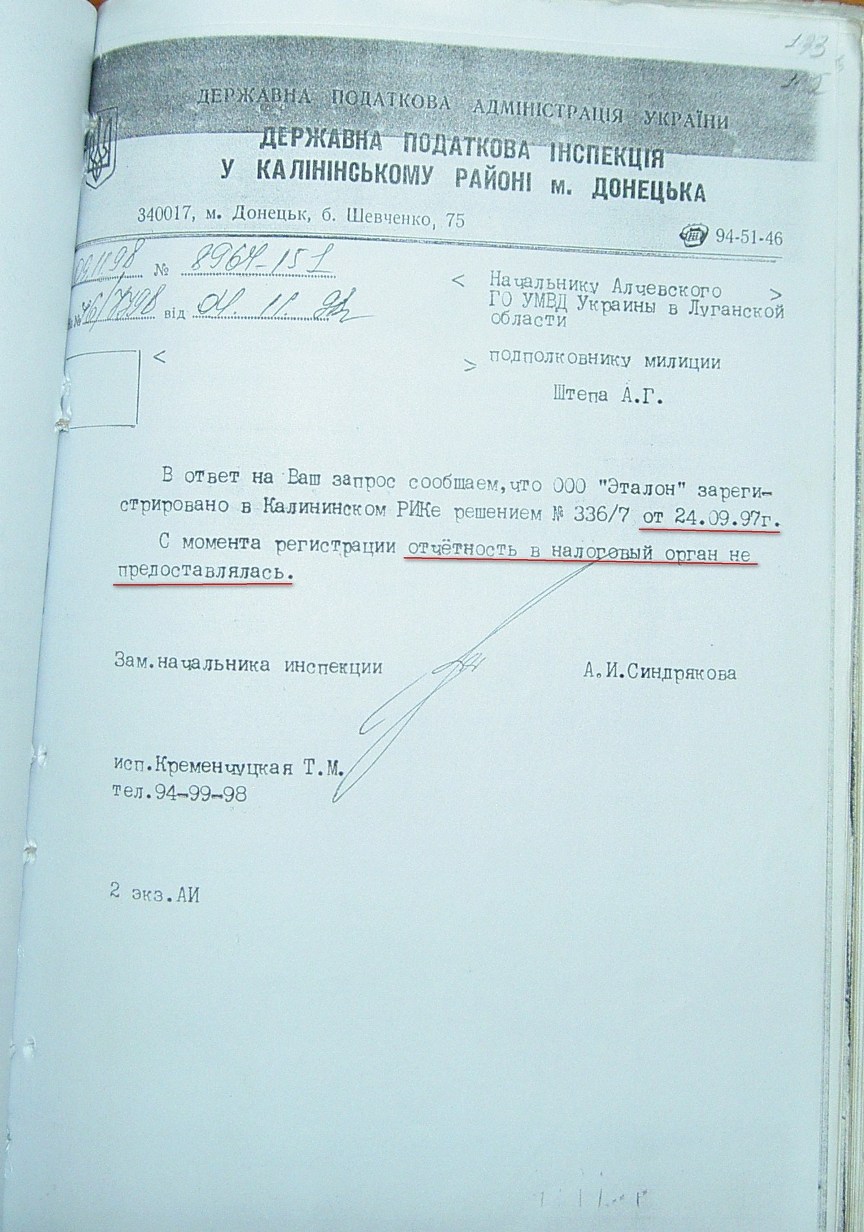 п.2 стр 282 т. №1 уголовного дела №27/99/0449PICT9457.JPG – ответ ГНИ Калининский район г. Донецк. – Зарегистрирован ООО«Эталон» 24.09.97 –отчетность с момента регистрации не предоставлялась.
