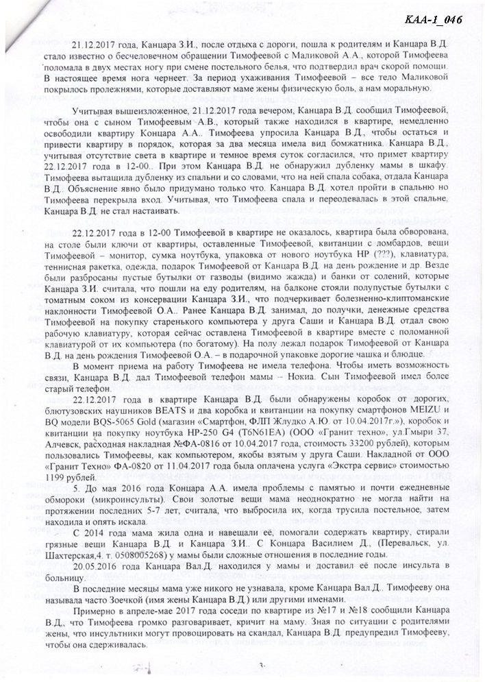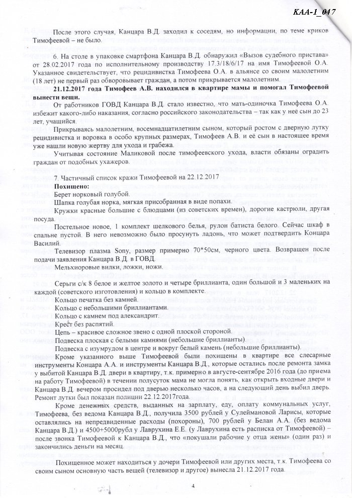 успехах Тимофеевой в квартире Концара А.А.. И после ухода Тимофеевой за мамой