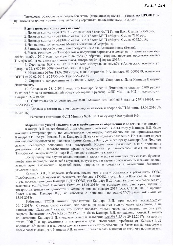 Тимофеевой мамы на пенсию Тимофеевой, вынуждают Канцара В.Д. подавать