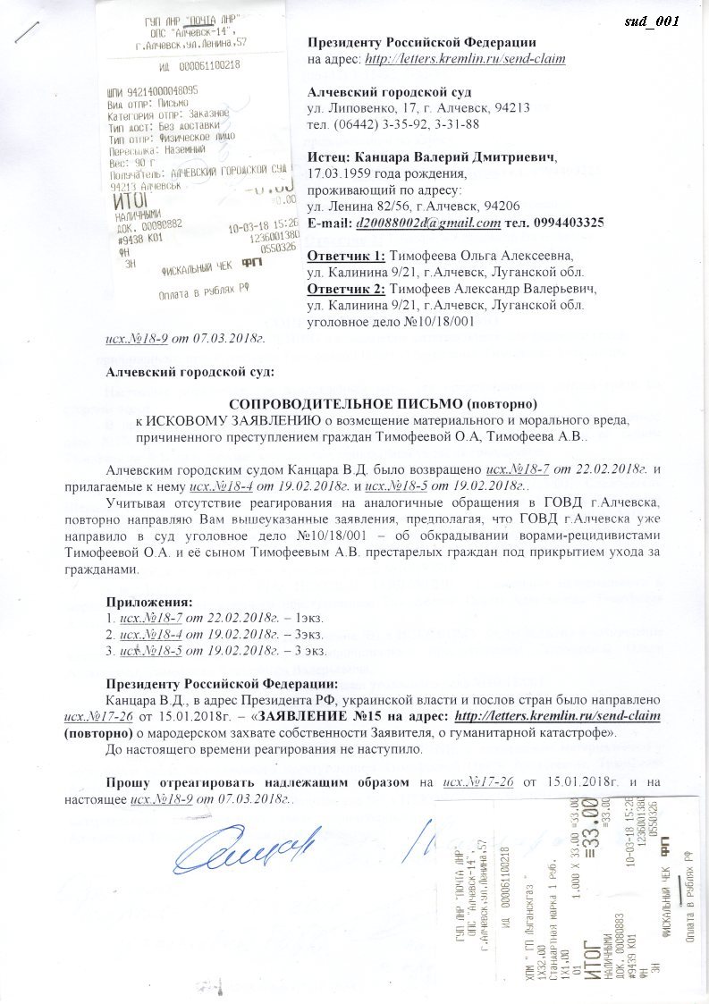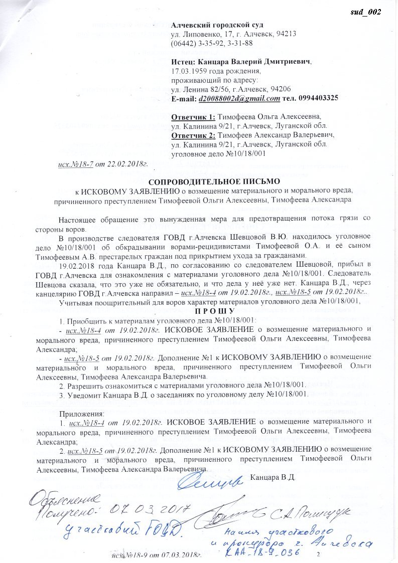 возложить на Ответчиков. Канцара В.Д. ![]() ![]() Заявления, подаваемые в суд. no.18-9 от 07.03.2018г. (2495) ![]() Заявления, подаваемые в суд. no.18-7 от 22.02.2018г. ![]() Заявления, подаваемые в суд. no.18-4 от 19.02.2018г. ![]() Заявления, подаваемые в суд. no.18-5 от 19.02.2018г. ![]() Заявления, подаваемые в суд. no.18-11 от 28.03.2018г. ![]() Уведомление в суд ![]() Постановление от 01.03.2018г. ![]() Доказательства отправки в ГОВД г.Алчевска. ![]() ![]() ![]() ![]() ![]() ![]() ![]() ![]() ![]() ![]() ![]() ![]() 05.03.2018 года Канцара В.Д. было получено заказное письмо из Алчевского городского суда с возвратом no.18-7 от 22.02.2018г. ![]() ![]() 'Згідно з оригіналом' Директор ППФ 'Дилайн' 10.08.2021г. Громадянин