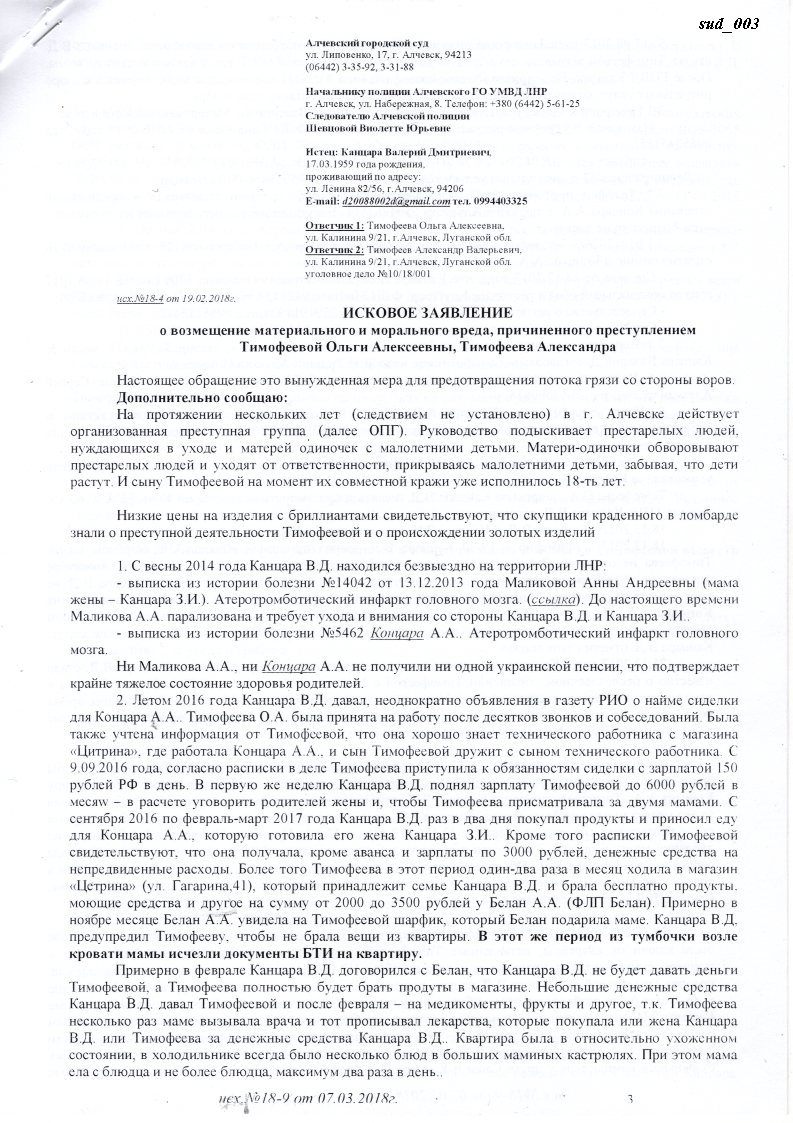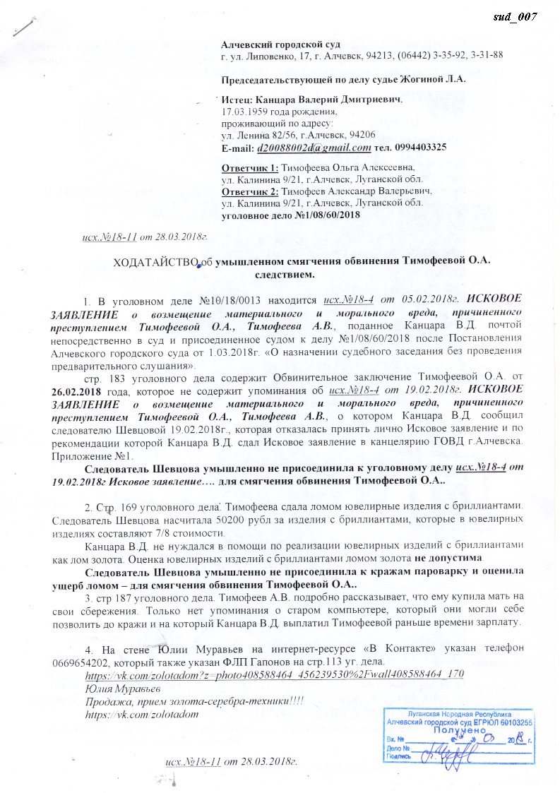Ленина 82/56, г.Алчевск, 94214 E-mail: d20088002d@gmail.com тел. 0994403325 Ответчик 1: Тимофеева