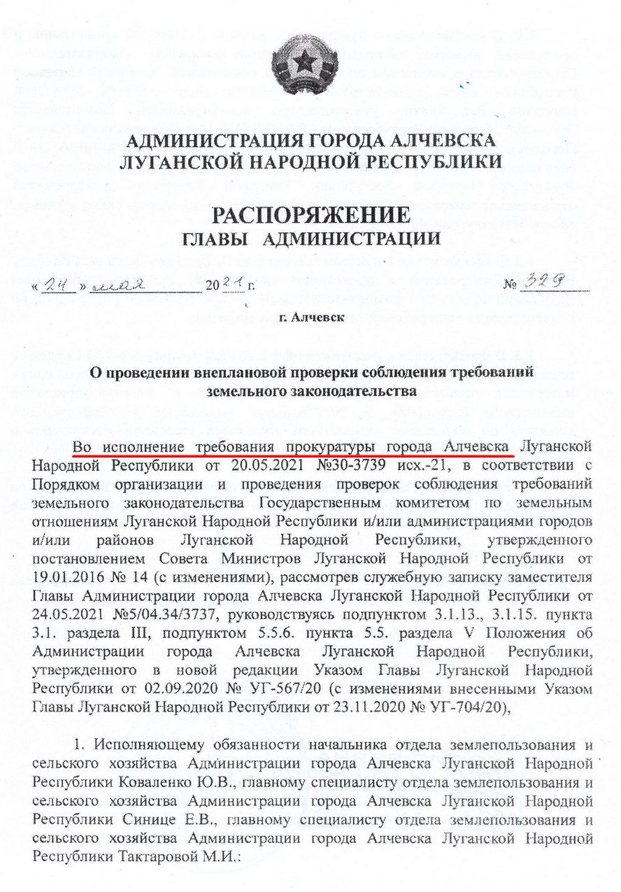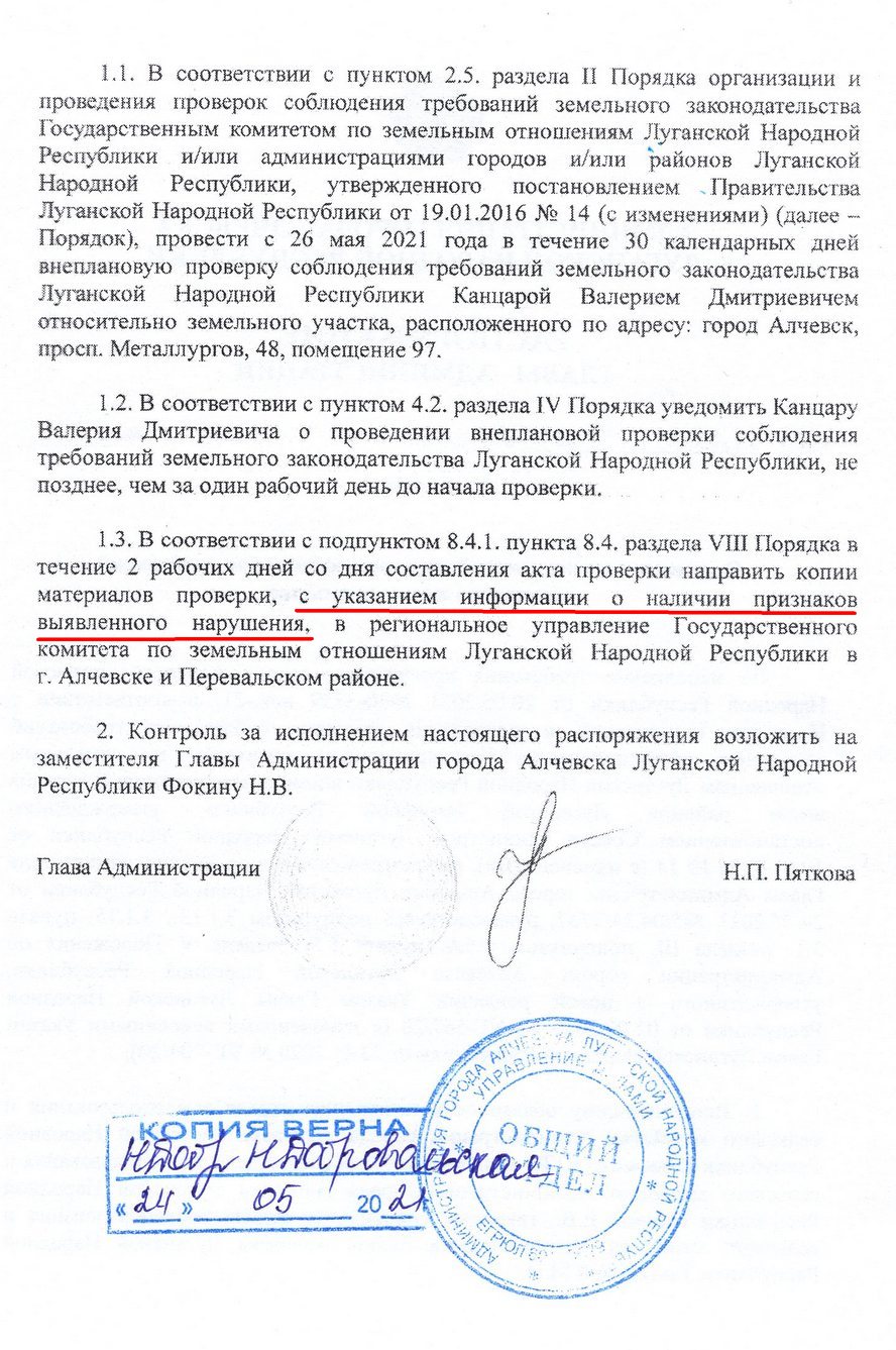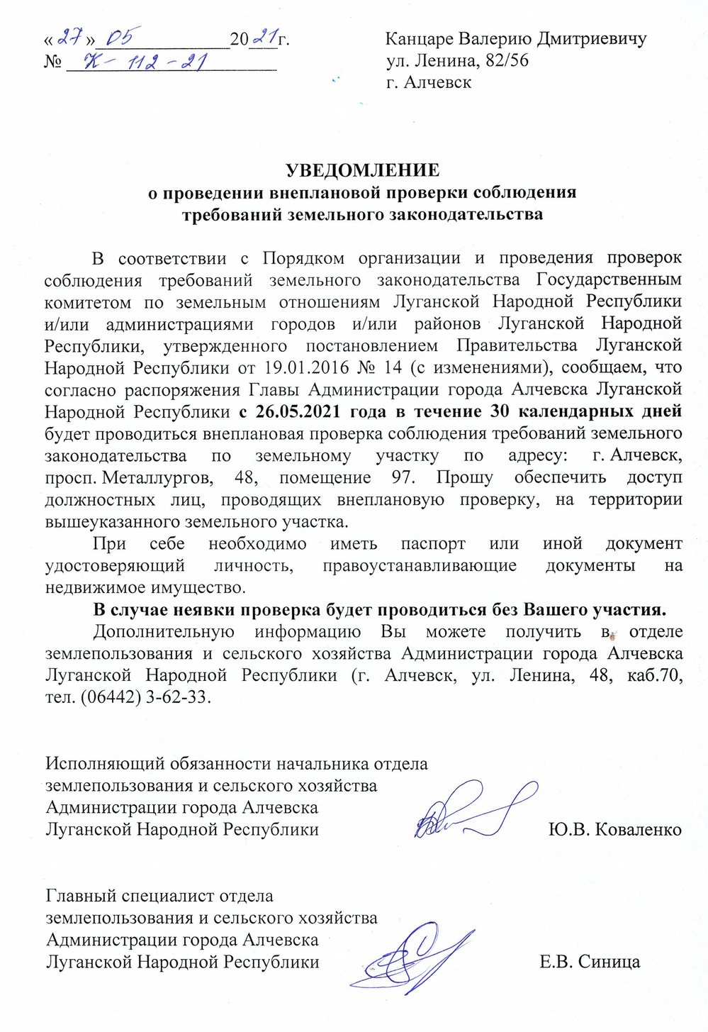 п.22 27.05.2021г. Т.н. ассимитричное реагирование властей на грабежи и разбой властей, указанный в no.21-30_lnr от 30.04.2021г. (3880) ЗАЯВЛЕНИЕ о возврате «отжатого» новой-старой властью автотранспорта и недвижимости, о компенсации убытков, о возвращении документов (дополнения к уставам предприятий). О снятии ареста/обременения с имущества Канцара В.Д.. О снятии незаконного опечатывания помещения по адресу: г.Алчевск, пр. Металлургов 48 и правомерность взыскания не предъявленных и не согласованных сумм земельного налога за период с 2016 года. Во всяком случае заявление no.21-30_lnr от 30.04.2021г. (3880) проверяющая и.о.начальника отдела землепользования Коваленко Юлиана Вит. не выпускала из рук. Остальные проверяющие начальник отдела градостроительства и архитектуры Ульяницкая Ел. Петровна, Чариков Артем Евгеньевич.