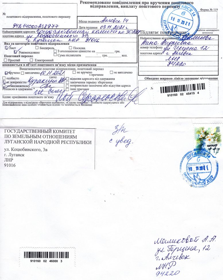 п.1 Докумены, направленные по почте и электронным письмом в Госкомзем ЛНР.