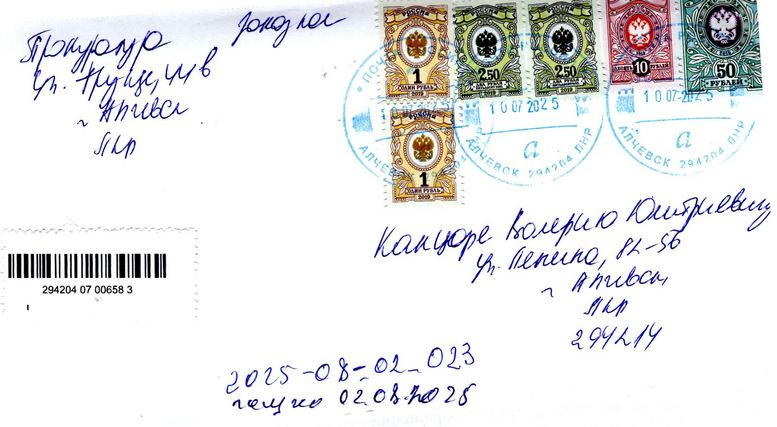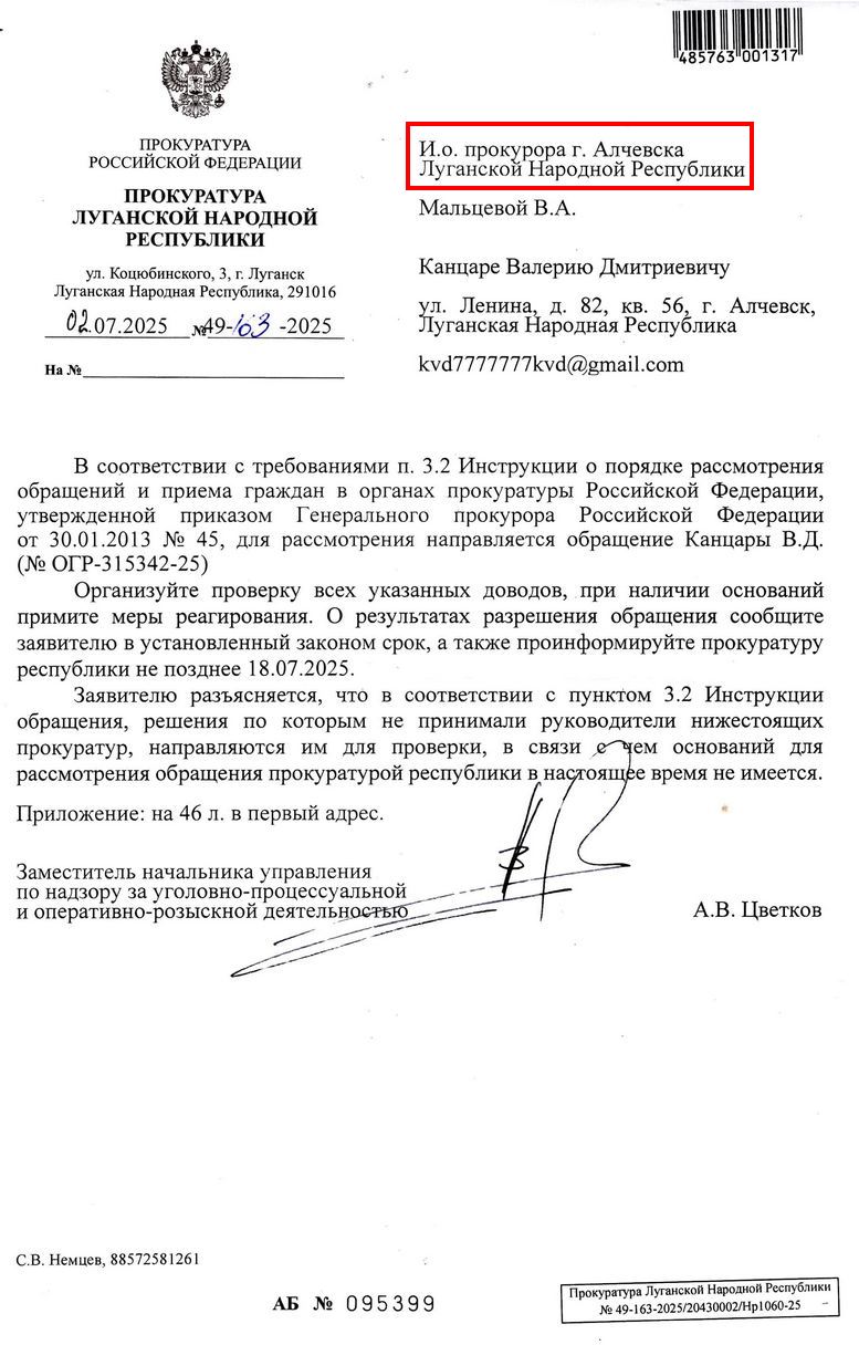 п.13 17.07.2025г. Ответ Прокуратура ЛНР 10.07.2025г. Прокуратура ЛНР, вероятно, на настоящее no.25-19_RF_LNR от 16.06.2025г. (4260) "ЗАЯВЛЕНИЕ о рейдерстве власти ЛНР-РФ...", направила в прокуратуру г.Алчевска - "для проверки", так как ошибочно считает, что в прокуратуре г.Алчевске не знают об этом преступлении власти и, поэтому, не приняли решения: