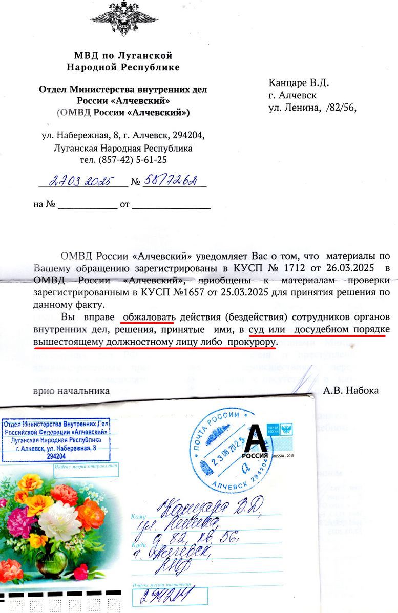 от 30.05.2025г. (4256 id = 34426), (4264 id = 34426) МВД ЛНР зарегистрировало материалы и.. передало в ОМВД "Алчевский", это где фигурант материалов участковый г-н Бродов Н.Ю. и другие соучастники – "для принятия законного решения".