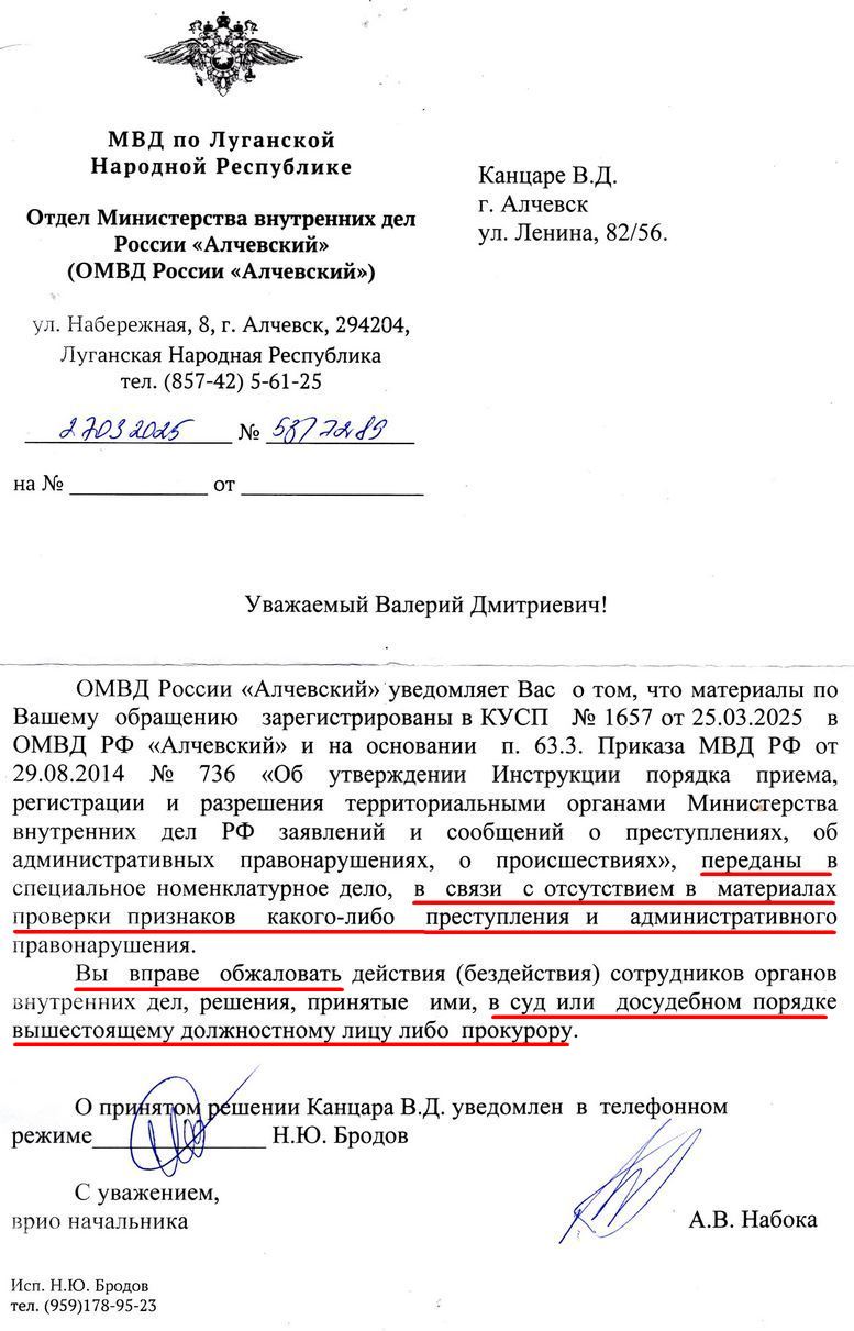 п.5 в (4244) и в (4246) 27.03.2025г. Уважаемый (ая) Канцара Валерий Дмитриевич! Вы получили это письмо, потому что направляли обращение 3/257708373725 в адрес МВД России. Во вложении письма находится ответ на Ваше обращение. Данное письмо сгенерировано автоматически и не требует ответа. Из ответа ОМВД России "Алчевский", исполнитель Бродов Н.Ю. (тел. +79591789523) №3/257708373725 (4244 id = 34185) от 27.03.2025г., возможно на настоящее заявление о преступленнии no.25-10_RF_LNR от 19.03.2025г. (4244) или no.25-11_RF_LNR от 19.03.2025г. (4246): "...в связи с отсутствием в материалах проверки признаков какого-либо преступления и административного правонарушения. О принятом решении Канцара В.Д. уведомлен в телефонном режиме (подпись) Н.Ю.Бродов. То же №3/257708423338 (4244 id = 34186). Вы вправе обжаловать ... в суд... вышестоящему должностному лицу либо прокурору.