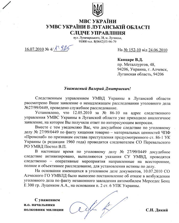 Страница 33. (324 Страница 33) Запрос no.4-10 от 04.01.2010г. (3370) (3-94_0449_029, папка Scanner) по уголовному делу no.27/99/0449. Ответ Перевальского РО ГУ МВД Украины от 04.06.2010 года (324 Страница 33.), в котором указано, что «Канцара В.Д. признан потерпевшим и гражданским лицом по уголовному делу no.27/99/0449», перечислены частично ж/д вагоны с похищенной продукцией, «истребованы материалы арбитражного производства в г.Симферополе, произведена выемка документов хозяйственного дела в Днепропетровском хозяйственном суде» и другое… Указанные выемки дел в хозяйственных судах ограничили возможность Канцара В.Д. в получении присужденной сатисфакции, т.к. суды приостановили рассмотрение дел до настоящего времени. Запрос no. 86-10 от 12.05.2010г. Отписки МВД и Прокуратуры Луганской области (3-94_0449_044). Запрос no.152-10 от 24.06.2010г., повторно на ГПУ. Ответ УМВД Украины в Луганской области от 17.06.2010г. – дело повторно прекратили и повторно отменили постановление о прекращении. Ответ от 16.07.2010г. К-325 – незаконно исключили эпизод хищения автомобиля Мерседес Е300 (Сафонов).