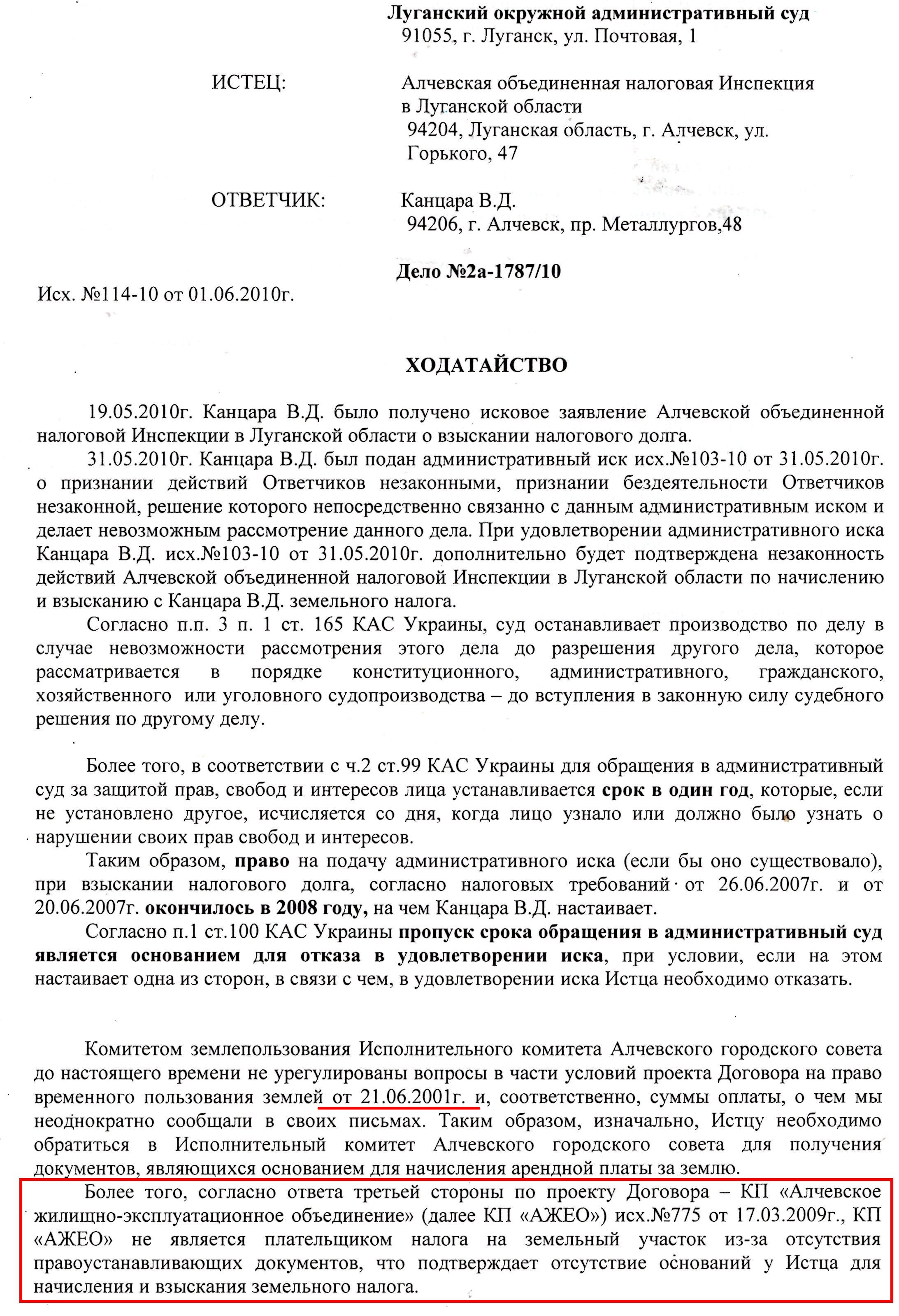 19.05.2010г. Канцара В.Д. было получено исковое заявление Алчевской объединенной налоговой инспекции в Луганской области о взыскании налогового долга.
