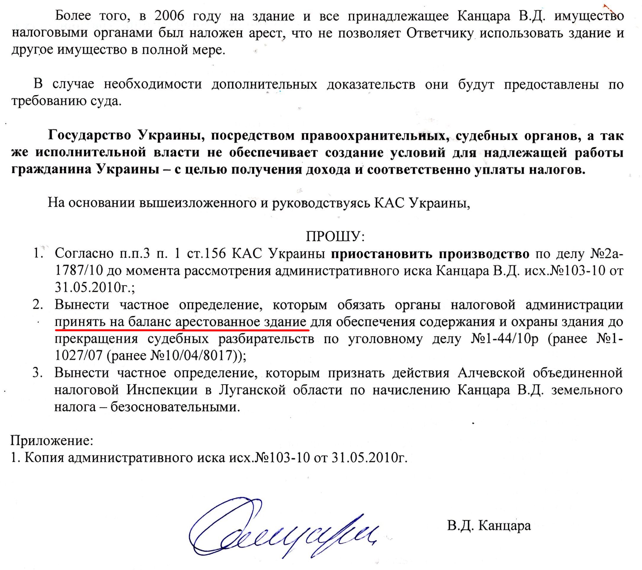 31.05.2010г. Канцара В.Д. был подан административный иск исх.№103-10 от 31.05.2010г. о признании действий Ответчиков незаконными, признании бездеятельности Ответчиков незаконной, решение которого непосредственно связанно с данным административным иском и делает невозможным рассмотрение данного дела. При удовлетворении административного иска Канцара В.Д. исх.№103-10 от 31.05.2010г. дополнительно будет подтверждена незаконность действий Алчевской объединенной налоговой Инспекции в Луганской области по начислению и взысканию с Канцара В.Д. земельного налога.