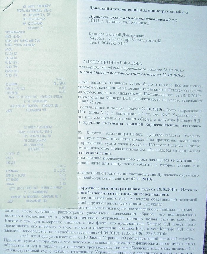 принято постановление от 18.10.2010г., подавался Алчевской объединенной налоговой инспекции в