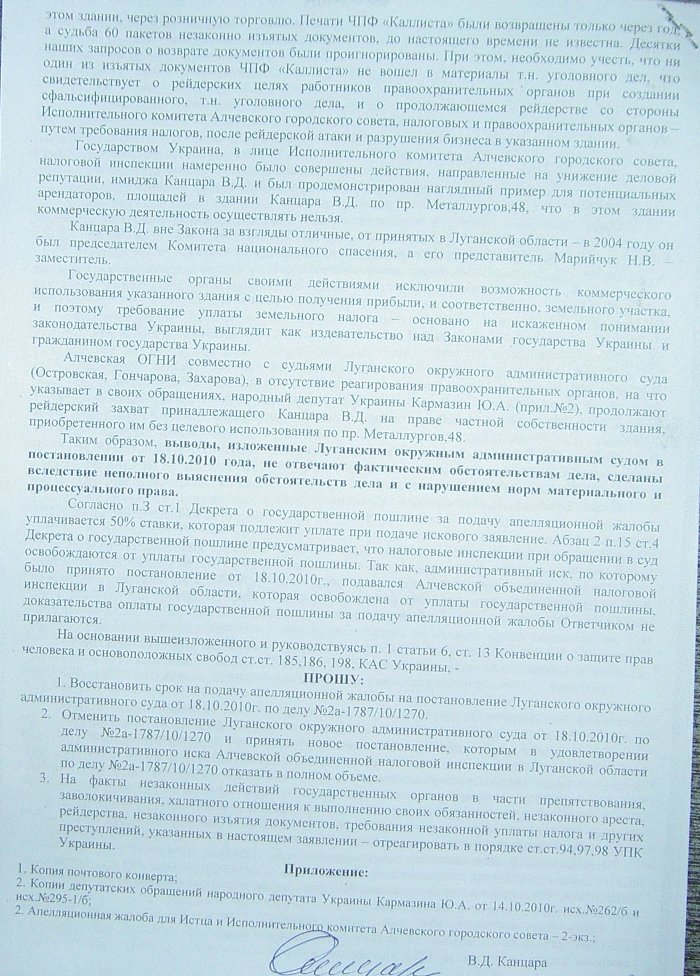 (прил.№2), продолжают рейдерский захват принадлежащего Канцара В.Д. на праве