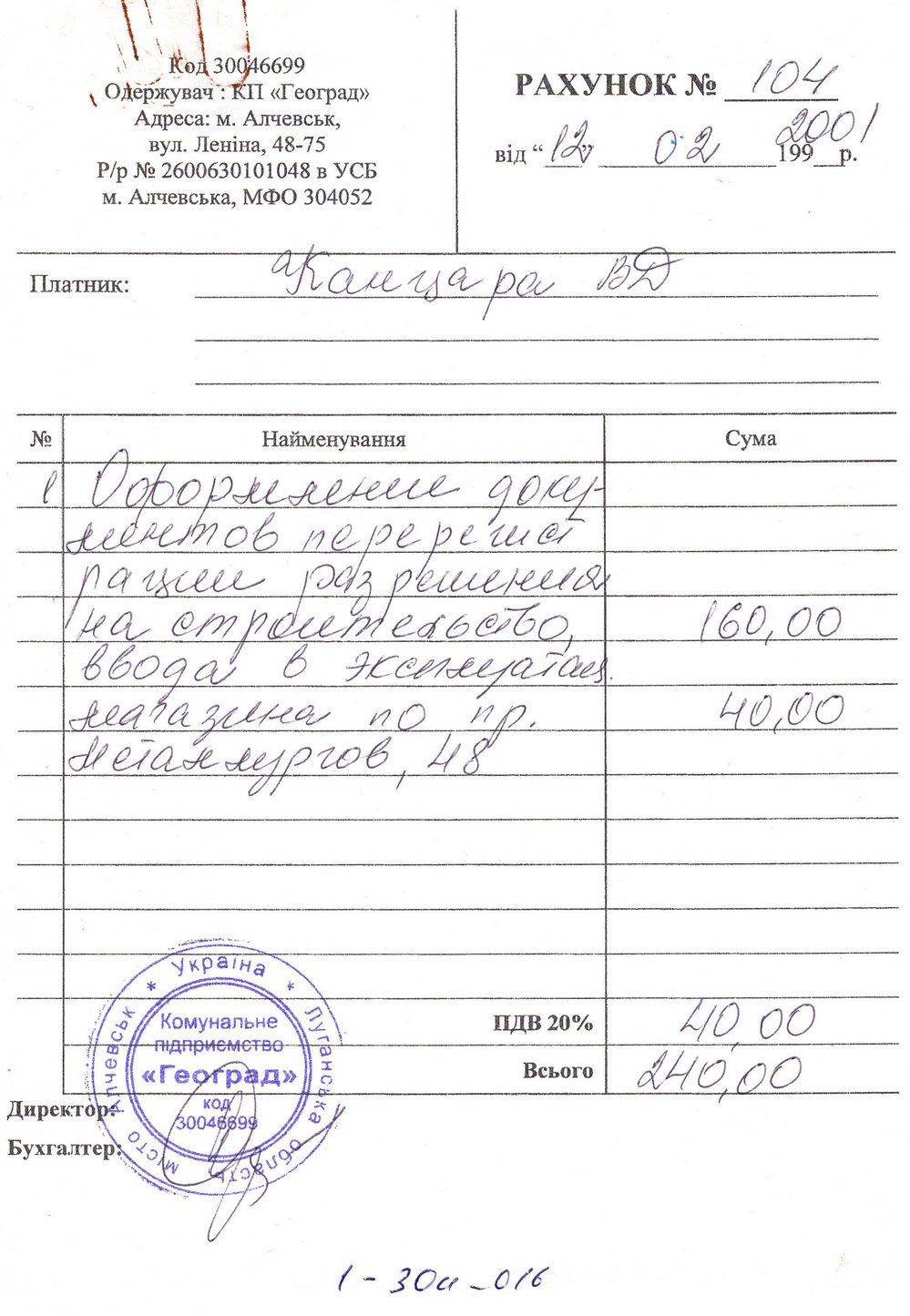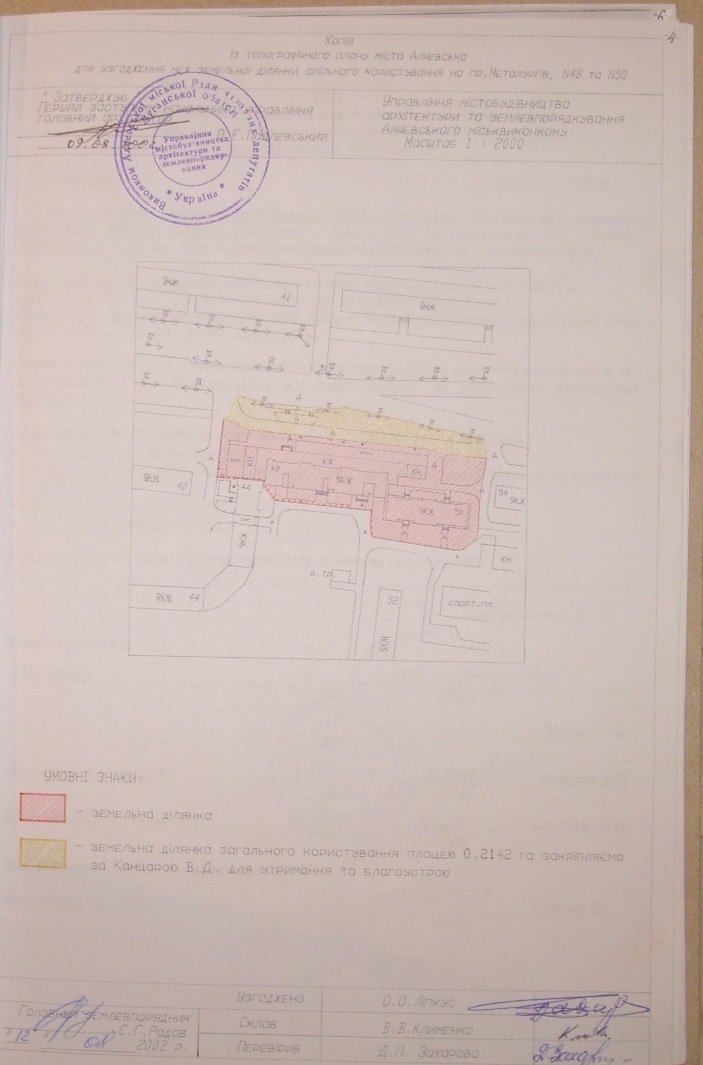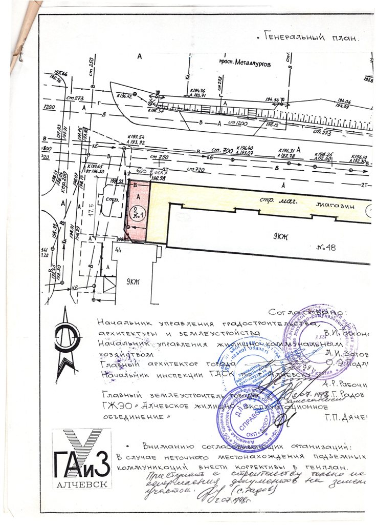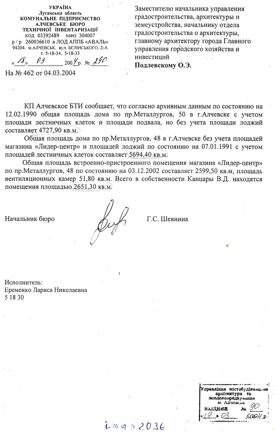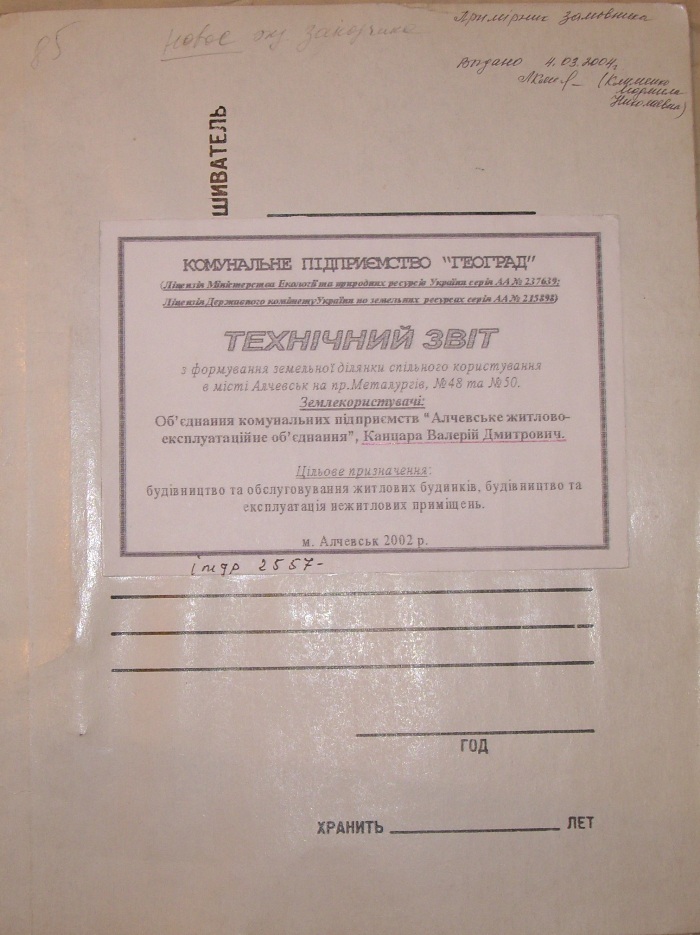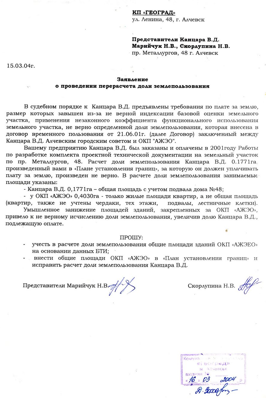 п.64. 15.03.2004г. О перерасчете долей землепользования в заказанном в КП "Геоград" договоре. Письмо №775 от 17.03.2009 года директора КП "АЖЭО" В.В. Собакина – КП "Алчевское жилищно-эксплутационное объдинение" не является плательщиком налога на земельный участок по пр-ту Металлургов,48 из-за отсутствия правоустанавливающих документов.