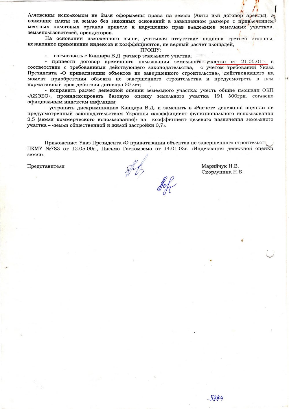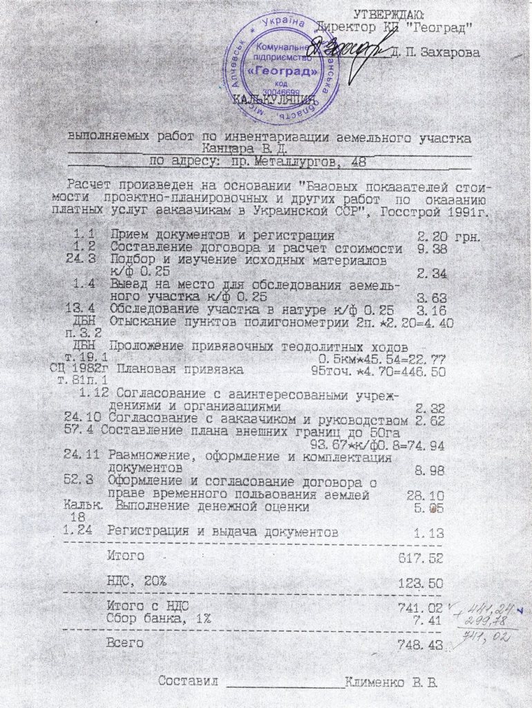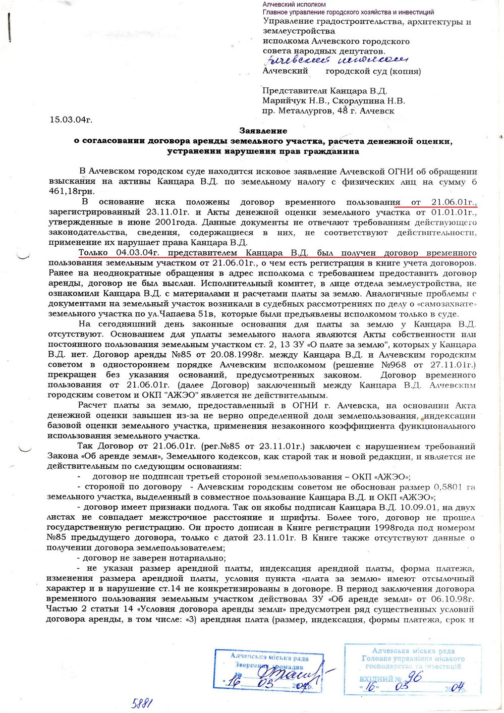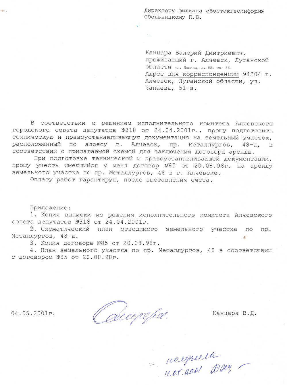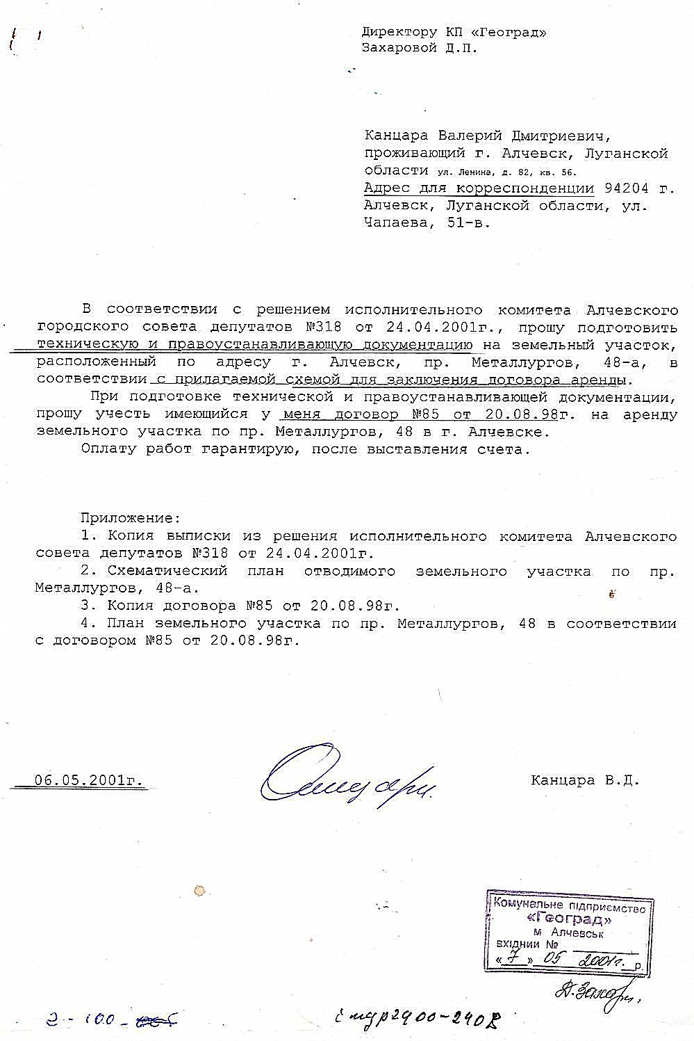 (373) Канцара В.Д. после 2001 года предпринимал неоднократные попытки подписания договора на аренду земельного участка – Отчет «КП Геоград» от 01.01.2002г. по вопросу выделения земельного участка по пр-ту Металлургов,48 (373). Отчет свидетельствует, что «КП Геоград» выполнил все необходимые работы и получил оплату. Очередной ответ от 11.03.2011 года исполнительной власти – у нас отсутствует "Технический отчет" КП Геоград, который мы им также направили через секретаря своим no.11-42 от 03.03.2011г. (374). Пишут свои ответы на наши обращения – не читая. Паспорт от 1998 года земельного участка по пр-ту Металлургов,48, который Канцара В.Д. оплатил.