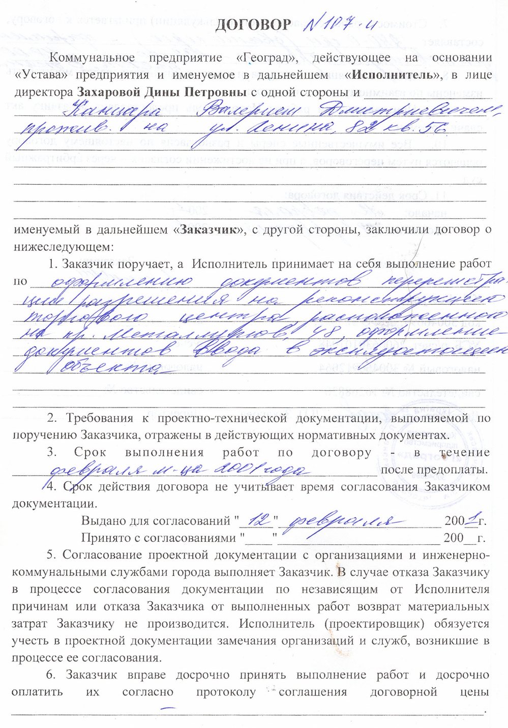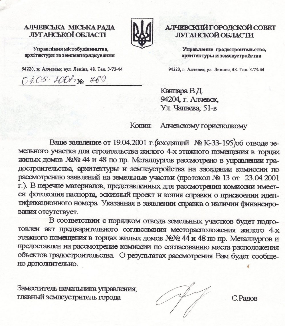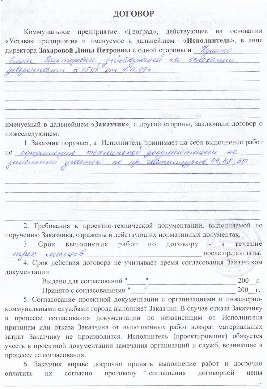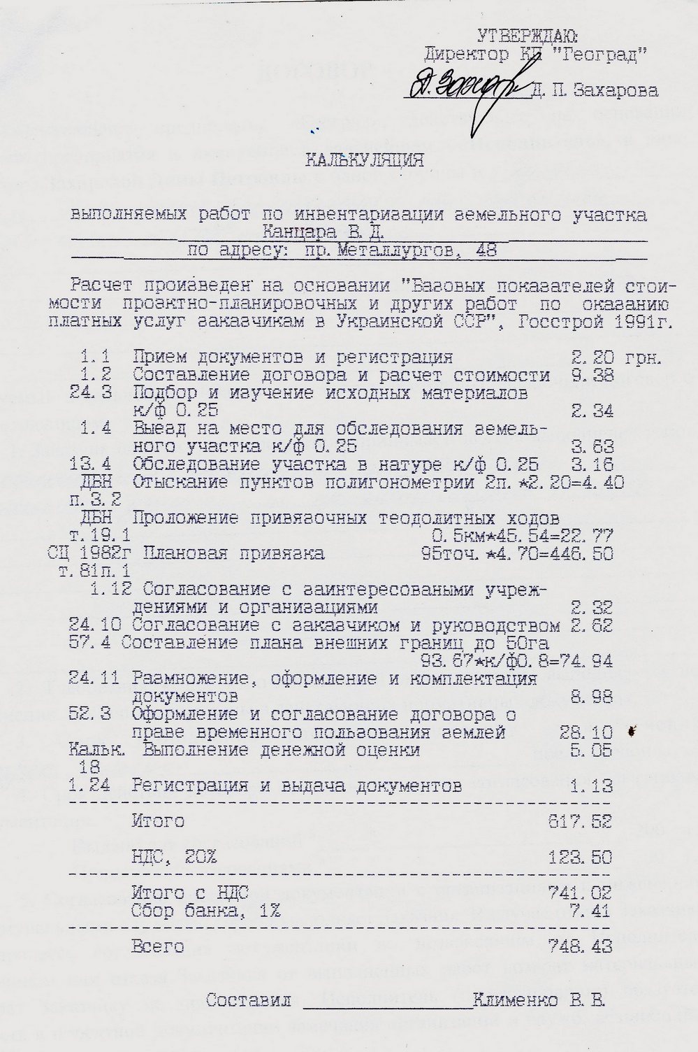 (373) Канцара В.Д. после 2001 года предпринимал неоднократные попытки подписания договора на аренду земельного участка – Отчет «КП Геоград» от 01.01.2002г. по вопросу выделения земельного участка по пр-ту Металлургов,48 (373). Отчет свидетельствует, что «КП Геоград» выполнил все необходимые работы и получил оплату. Очередной ответ от 11.03.2011 года исполнительной власти – у нас отсутствует "Технический отчет" КП Геоград, который мы им также направили через секретаря своим no.11-42 от 03.03.2011г. (374). Пишут свои ответы на наши обращения – не читая. Паспорт от 1998 года земельного участка по пр-ту Металлургов,48, который Канцара В.Д. оплатил.