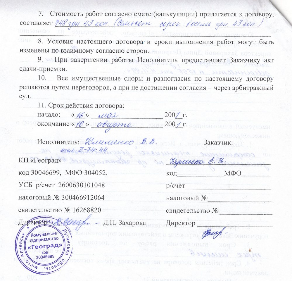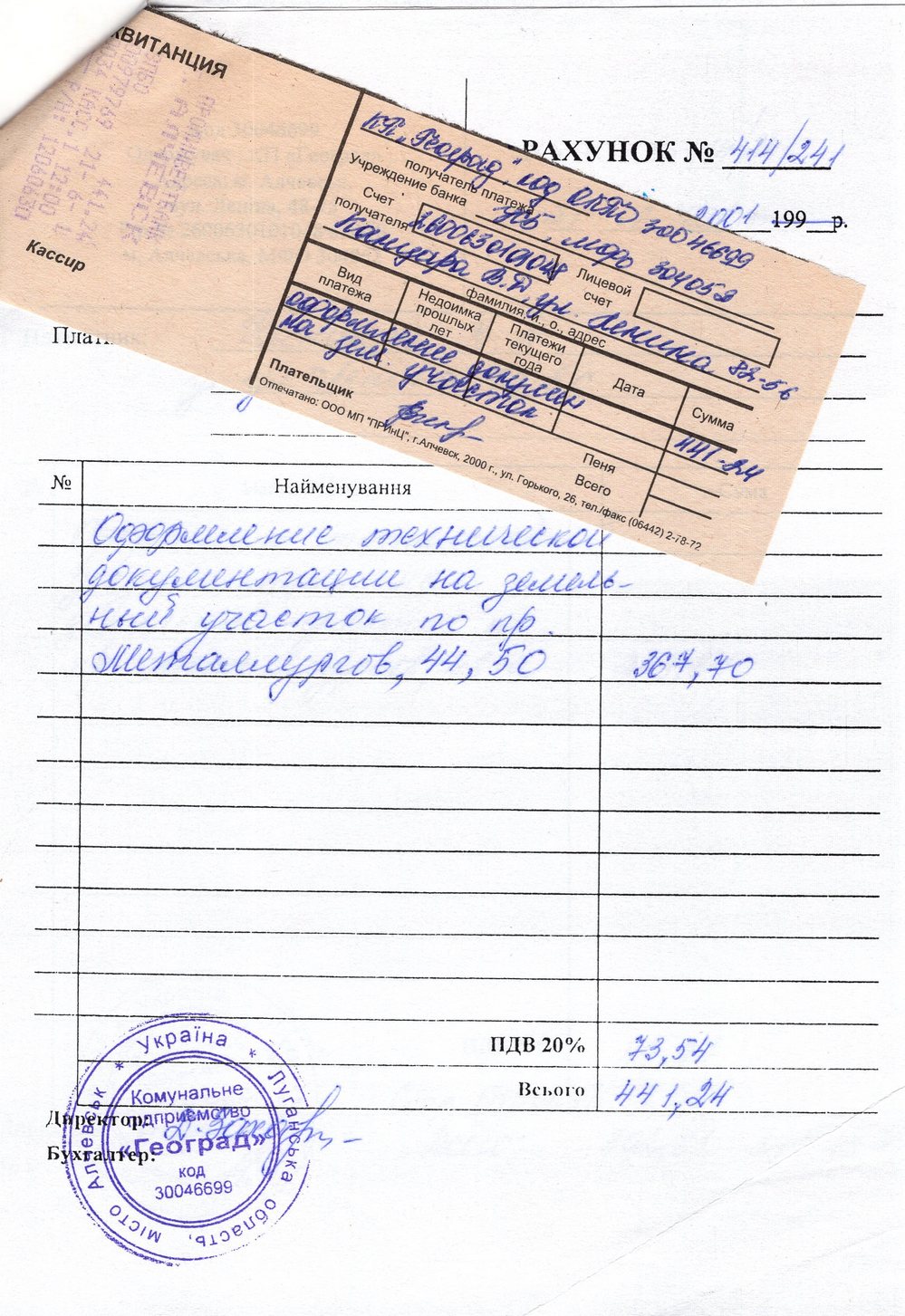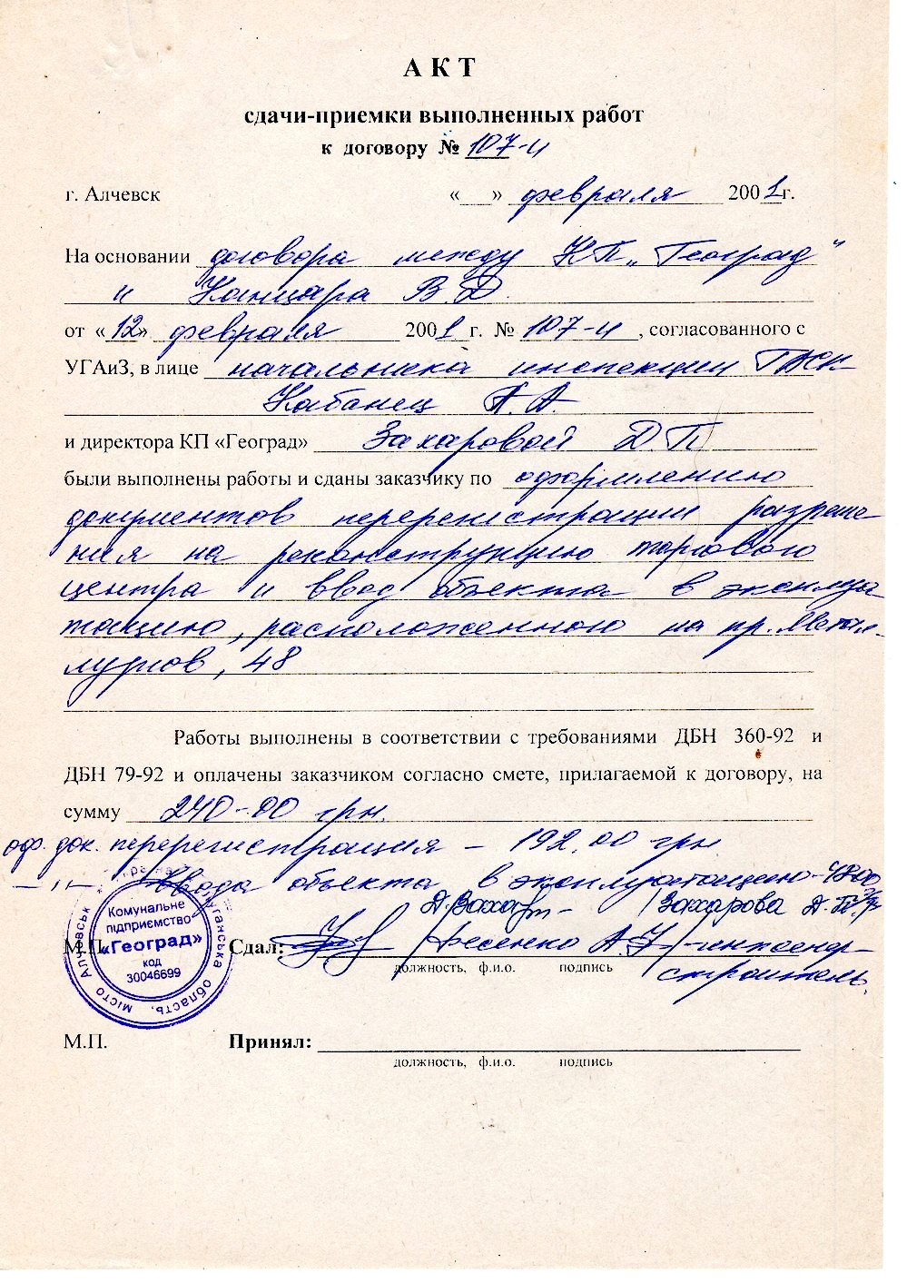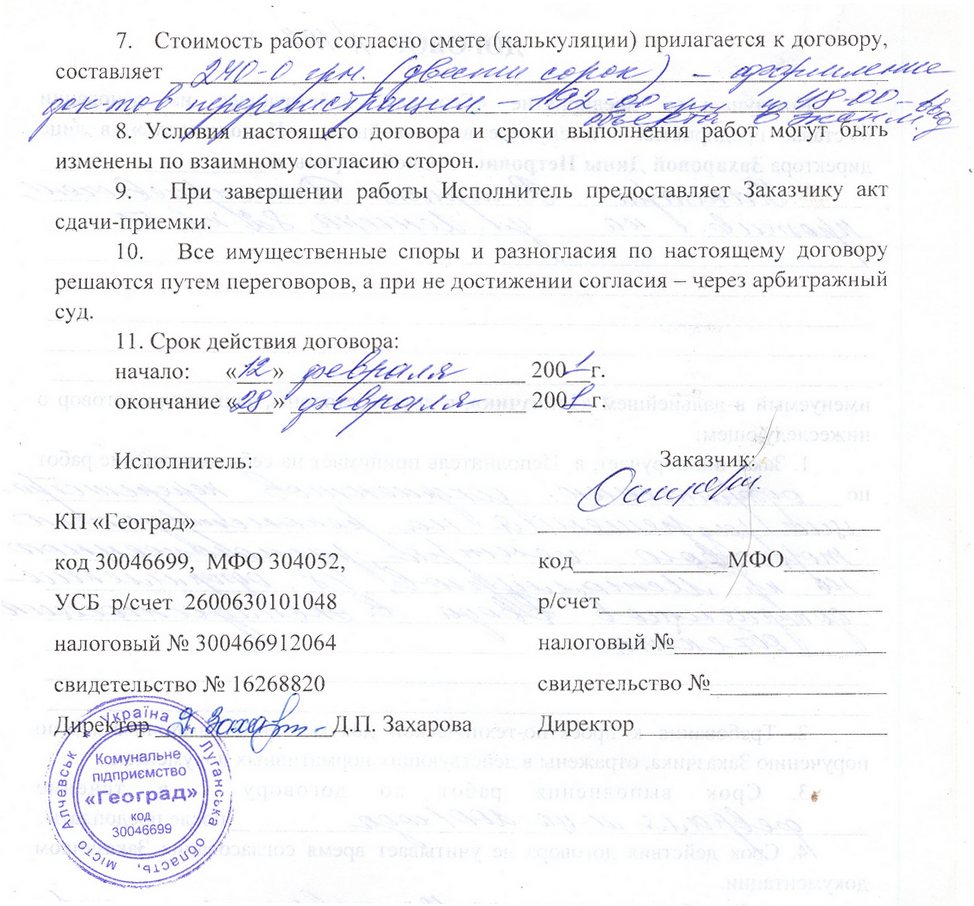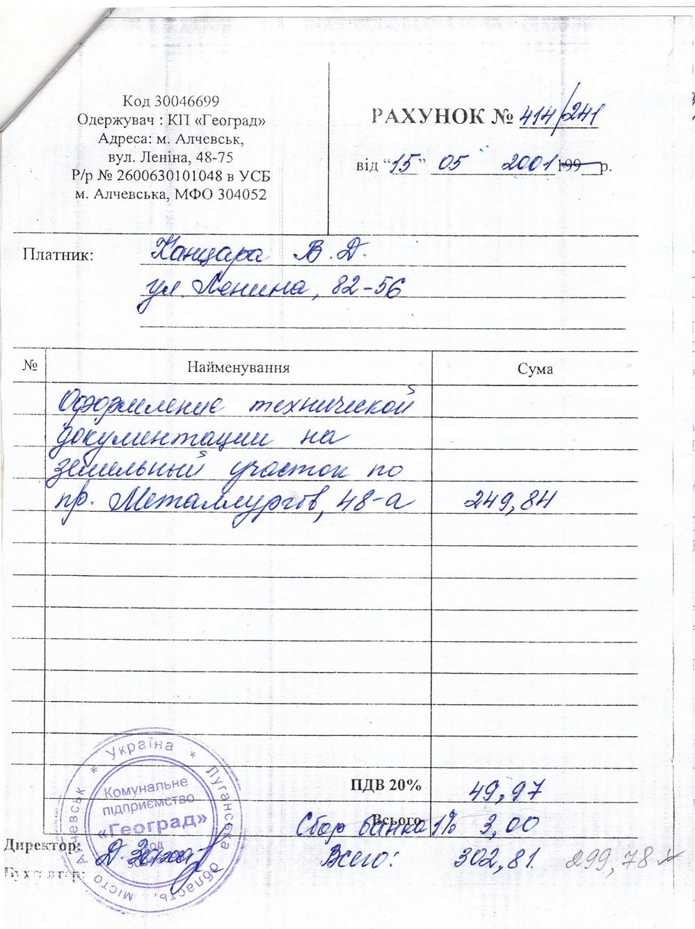 (373) Канцара В.Д. после 2001 года предпринимал неоднократные попытки подписания договора на аренду земельного участка – Отчет «КП Геоград» от 01.01.2002г. по вопросу выделения земельного участка по пр-ту Металлургов,48 (373). Отчет свидетельствует, что «КП Геоград» выполнил все необходимые работы и получил оплату. Очередной ответ от 11.03.2011 года исполнительной власти – у нас отсутствует "Технический отчет" КП Геоград, который мы им также направили через секретаря своим no.11-42 от 03.03.2011г. (374). Пишут свои ответы на наши обращения – не читая. Паспорт от 1998 года земельного участка по пр-ту Металлургов,48, который Канцара В.Д. оплатил.