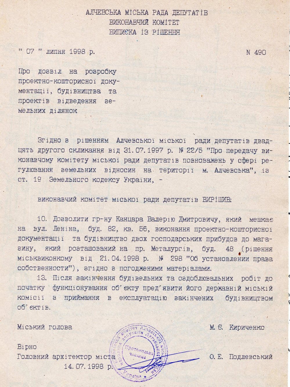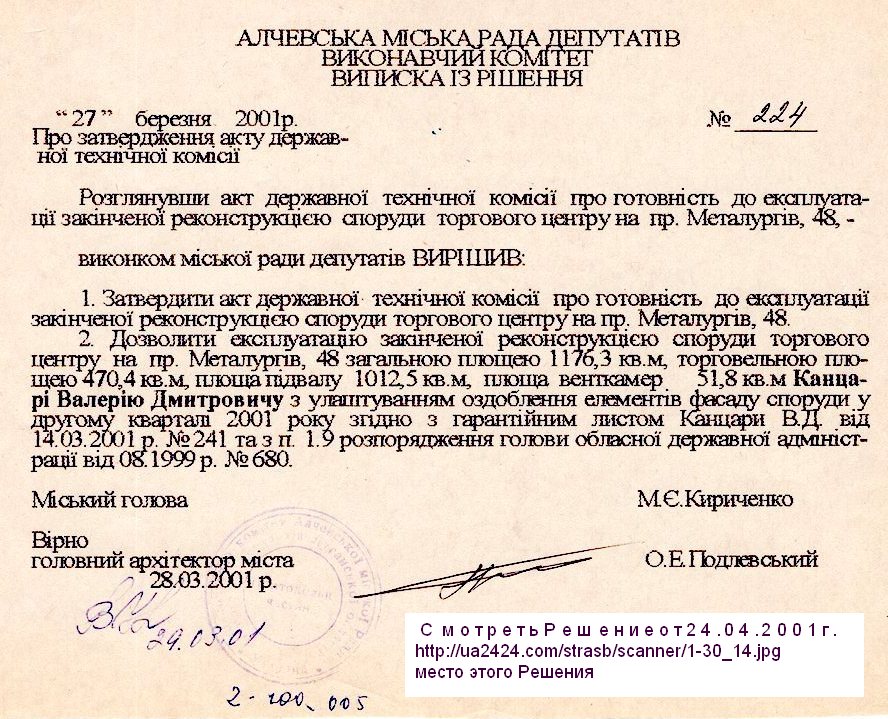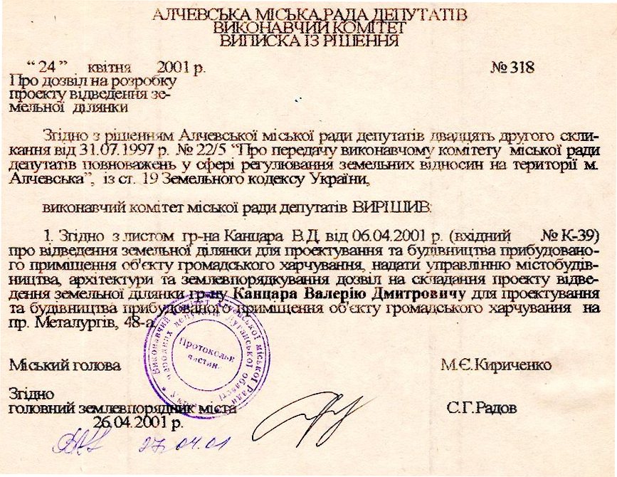 п.1-2п.1 Выписка из решения Алчевского исполкома от 27.03.2001 года и 24.04.2001 года.