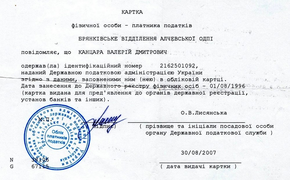 п.31. (17 id = 10182 п.31) Первая, вторая страница личного паспорта ЕК 759942, выдан Алчевским ГО УМВД 17.02.1998г. Канцара В.Д.. п.32. (17 id = 30136 п.32) Карточка no.2162501092 от 30.08.2007г. физического лица плательщика налогов Канцара В.Д.. п.33. (17 id = 21205 п.33) Справка no.0000372692 от 19.10.2017г. о взятии на учет внутренне-перемещенного лица Канцара В.Д.. п.34. Свидетельство о рождении Канцара Валерии Валерьевны. Дата рождения 03.06.1993г. (17 id = 7444 п.34).