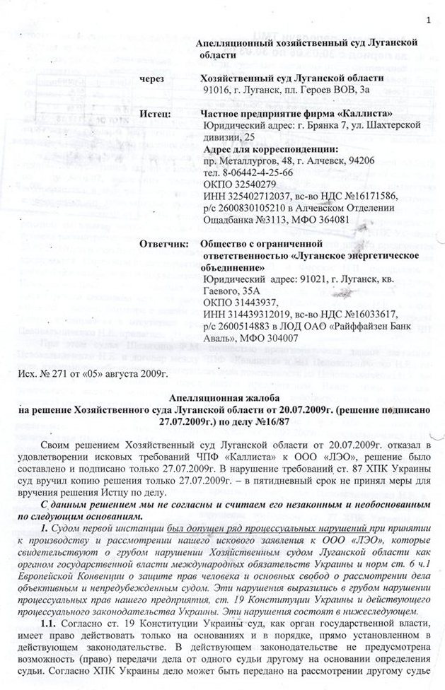1. Судом первой инстанции был допущен ряд процессуальных нарушений при принятии к производству и рассмотрении нашего искового заявления к ООО «ЛЭО», которые свидетельствуют о грубом нарушении Хозяйственным судом Луганской области как органом государственной власти международных обязательств Украины и норм ст. 6 ч.1 Европейской Конвенции о защите прав человека и основных свобод о рассмотрении дела объективным и непредубежденным судом. Эти нарушения выразились в грубом нарушении процессуальных прав нашего предприятия, ст. 19 Конституции Украины и действующего процессуального законодательства Украины. Эти нарушения состоят в нижеследующем.