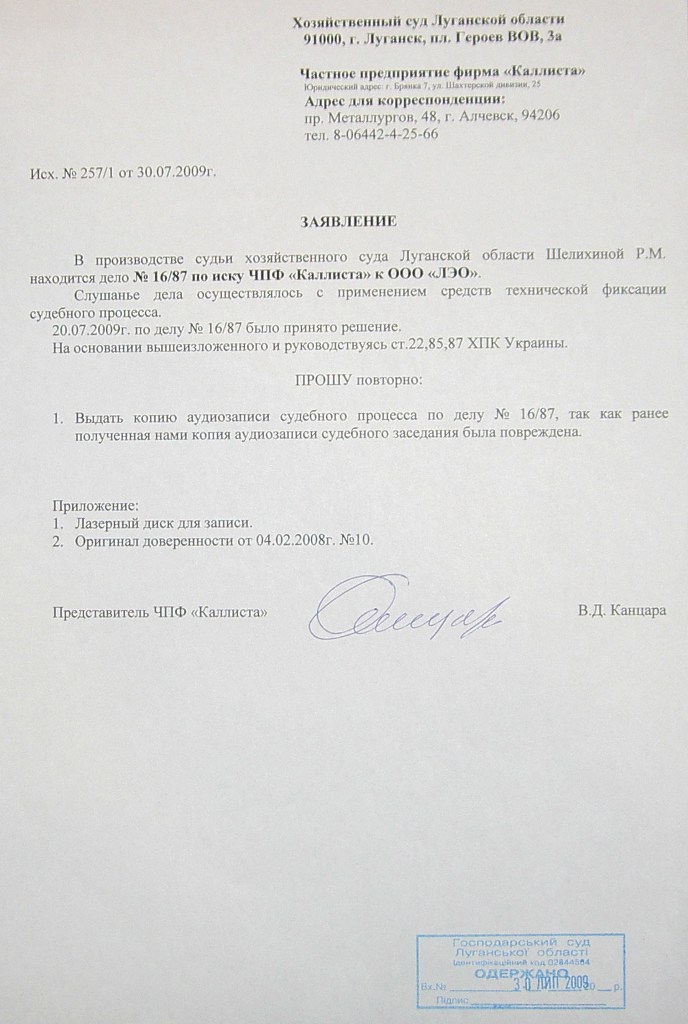 Наши подозрения в отношении того, что в Хозяйственном суде Луганской области произошел преступный сговор с целью предоставления незаконных привилегий ответчику по делу no.16/87, вынесения заведомо неправосудного решения по делу, полностью подтвердились в ходе рассмотрения судебного дела. Мы прилагаем к данному заявлению копию диска со звукозаписью судебного заседания, который явно подтверждает факт незаконных действий судьи Шелихиной Р.М. и вынесение ею заведомо неправосудного решения по нашему иску. Так, судья Шелихина Р.М. в нарушении ст. 77 ХПК Украины провела рассмотрение дела в отсутствие полномочных представителей нашего предприятия 20.07.2009г., тем самым грубо нарушив наши права и процессуальные нормы. Представители предприятия (сотрудники предприятия) Канцара В.Д. и Ферсюк Н.В. находились в служебной командировке и по уважительной причине не могли явиться в судебное заседание. Прилагаем копии подтверждающих документов. (Приложение no.3) О причинах неявки представители сообщили через частного предпринимателя Целовальниченко Н.Е., которая согласно условиям договора с нашим предприятием не имеет права представлять интересы нашего предприятия в отсутствие представителя Канцары В.Д. Копию договора с ЧП Целовальниченко Н.Е. прилагаем. (Приложение no.4)
