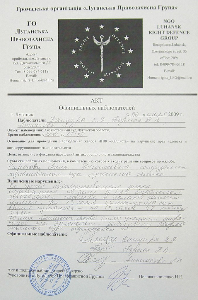 Своим решением Хозяйственный суд Луганской области от 20.07.2009г. отказал в удовлетворении исковых требований ЧПФ «Каллиста» к ООО «ЛЭО», решение было составлено и подписано только 27.07.2009г. В нарушение требований ст. 87 ХПК Украины суд вручил копию решения только 27.07.2009г. – в пятидневный срок не принял меры для вручения решения Истцу по делу.