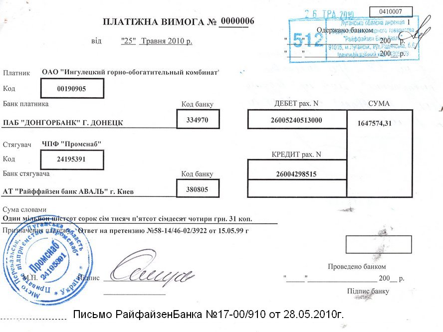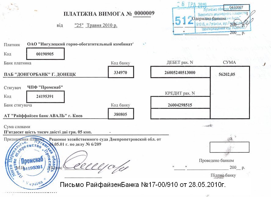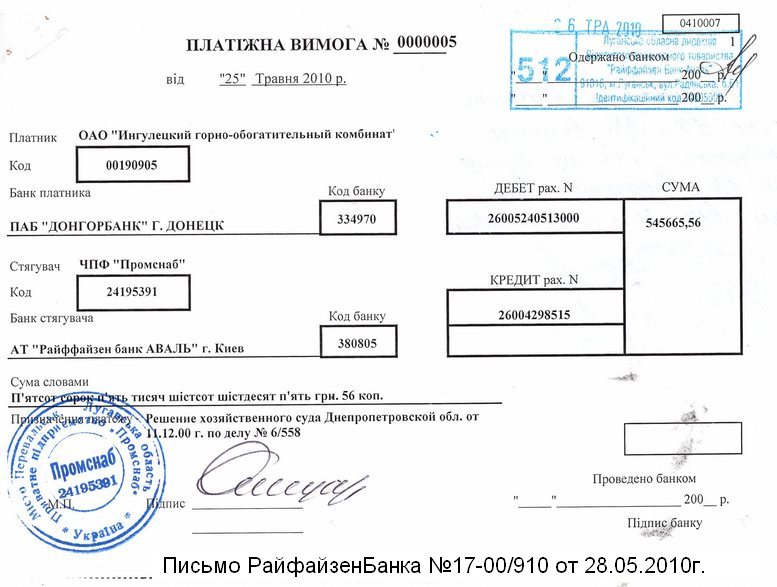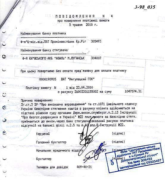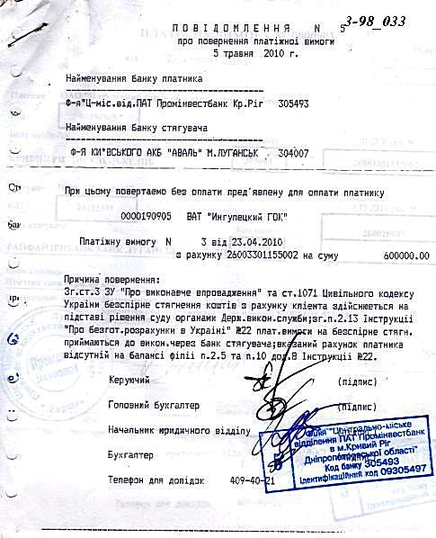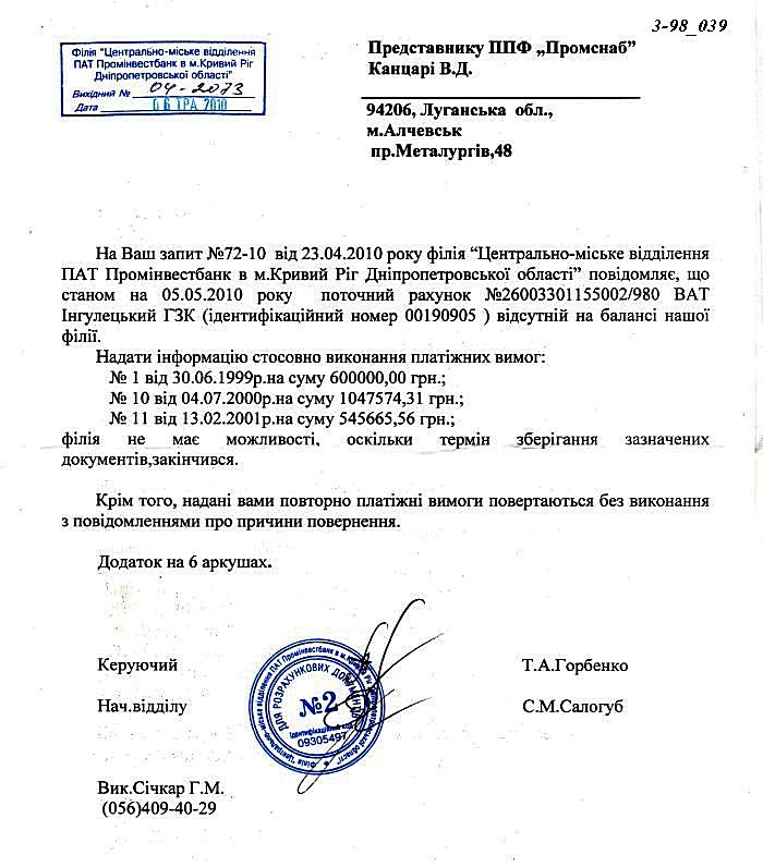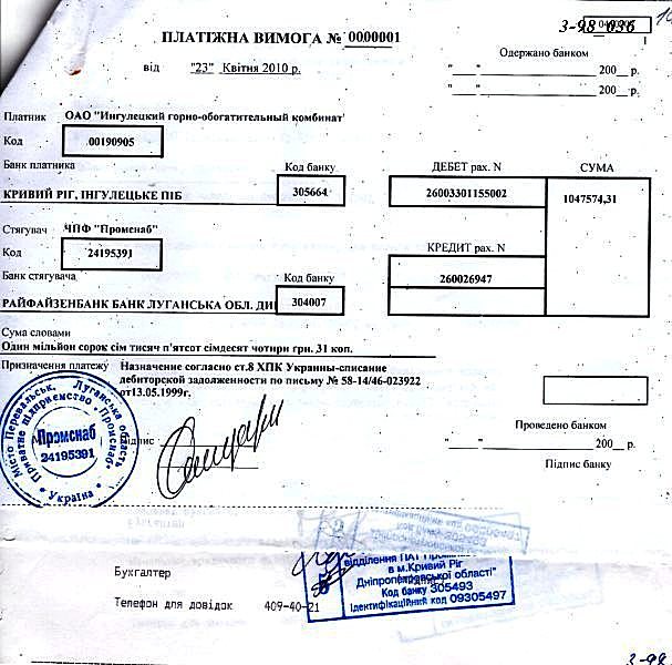 Письмом №34 от 13.02.2001г. ЧПФ «Промснаб» на основании ст.116 АПК Украины и п.141 Инструкции №7 «О безналичных расчетах» направила в Ваш адрес документы для бесспорного взыскания с расчетного счета ОАО «Ингулецкий горно-обогатительный комбинат» суммы 545 665,56грн. по приказу арбитражного суда Днепропетровской области от 11.12.2000г.