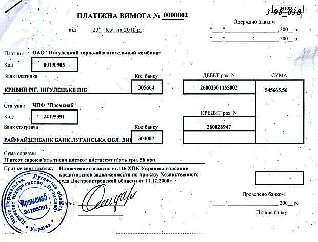 На основании ст.116 Арбитражно-процессуального кодекса Украины и п.141 Инструкции №7 «О безналичных расчетах» частное предприятие фирма «Промснаб» направляет в Ваш адрес документы для бесспорного взыскания с расчетного счета ОАО «Ингулецкий горно-обогатительный комбинат» суммы 545 665,56грн. по приказу арбитражного суда Днепропетровской области от 11.12.2000г.