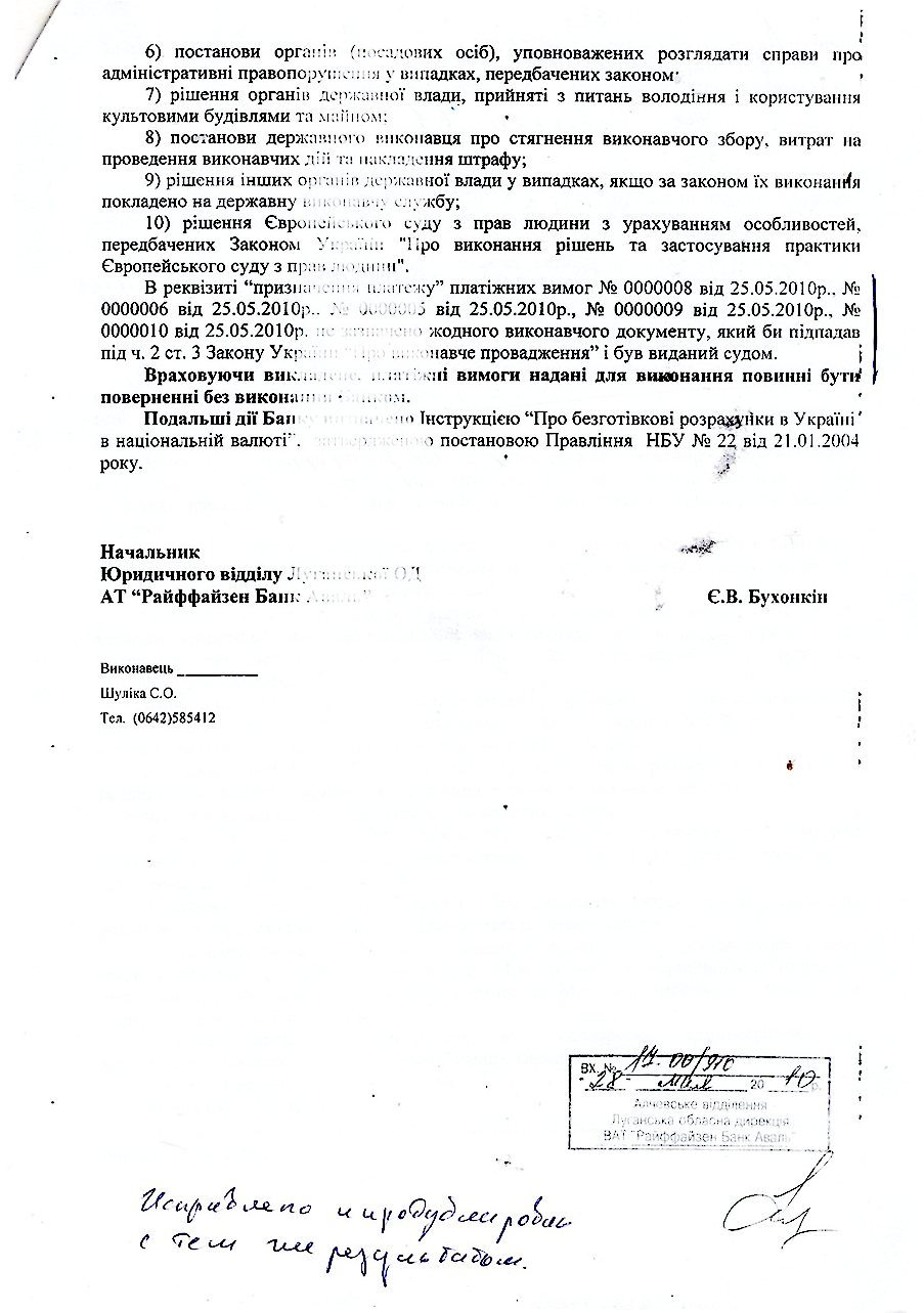Указанную сумму перечислить на наш расчетный счет №2600092 в АППБ «Аваль» в г. Алчевске Луганской области, либо направить в наш адрес справку о наличии у должника картотеки №2 (внебалансовый счет 9929 «Расчетные документы, обязательные к оплате»), в которой поименованы исполнительные платежные документы по нашему заявлению с указанием дата помещения в картотеку платежного требования №11.