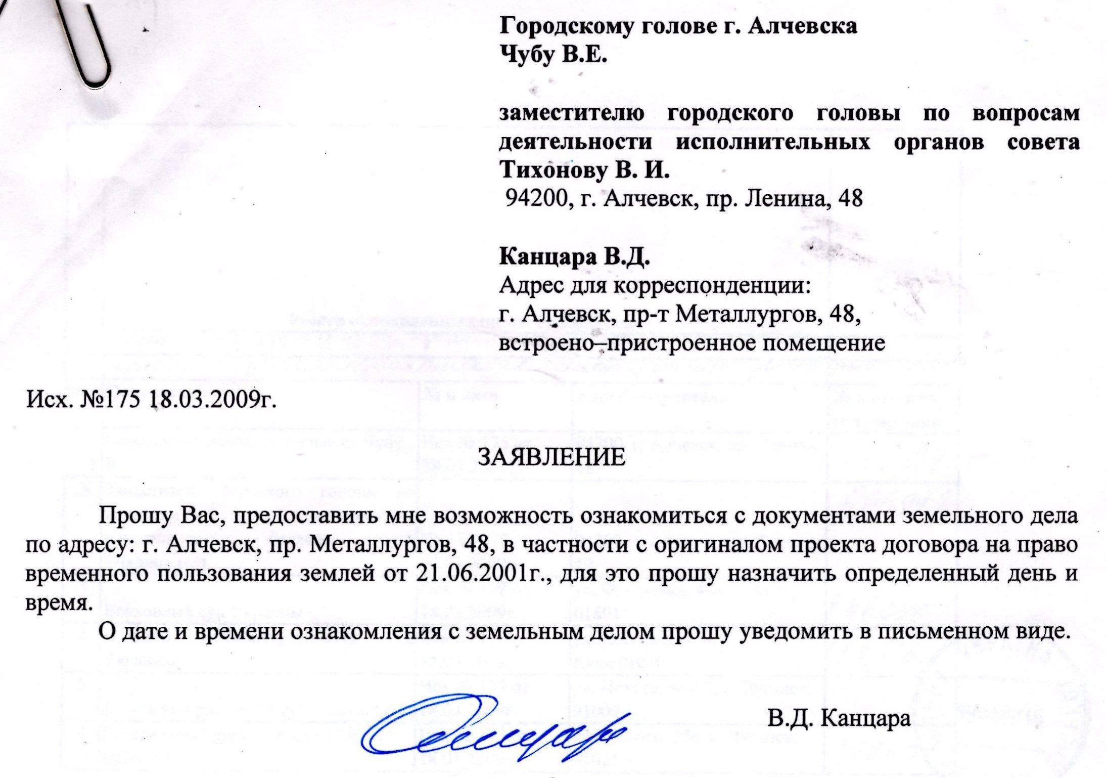 постановления об отказе в возбуждении уголовного дела. Приложение только в адрес прокуратуры г. Алчевска: 1. Копия 06.04.2001г. заявления об отводе земельного
