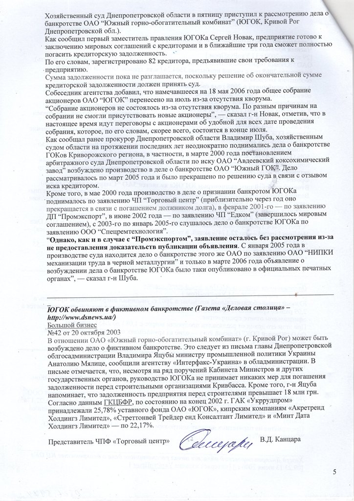 банкротстве ОАО “Южный ГОК”. Дело рассматривалось по март 2005 года и было