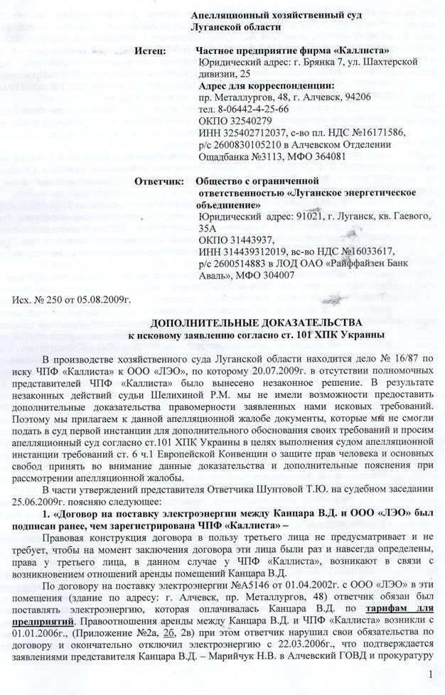В производстве хозяйственного суда Луганской области находится дело № 16/87 по иску ЧПФ «Каллиста» к ООО «ЛЭО», по которому 20.07.2009г. в отсутствии полномочных представителей ЧПФ «Каллиста» было вынесено незаконное решение. В результате незаконных действий судьи Шелихиной Р.М. мы не имели возможности предоставить дополнительные доказательства правомерности заявленных нами исковых требований. Поэтому мы прилагаем к данной апелляционной жалобе документы, которые мы не смогли подать в суд первой инстанции для дополнительного обоснования своих требований и просим апелляционный суд согласно ст.101 ХПК Украины в целях выполнения судом апелляционной инстанции требований ст. 6 ч.1 Европейской Конвенции о защите прав человека и основных свобод принять во внимание данные доказательства и дополнительные пояснения при рассмотрении апелляционной жалобы.