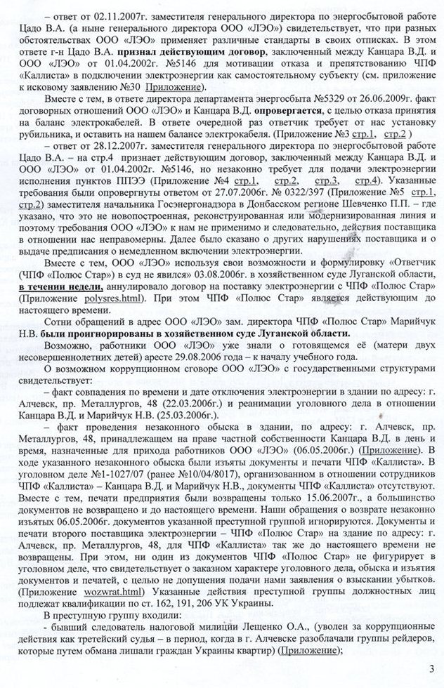 – факт проведения незаконного обыска в здании, по адресу: г. Алчевск, пр. Металлургов, 48, принадлежащем на праве частной собственности Канцара В.Д. в день и время, назначенные для прихода работников ООО «ЛЭО» (06.05.2006г.) (Приложение). В ходе указанного незаконного обыска были изъяты документы и печати ЧПФ «Каллиста». В уголовном деле №1-1027/07 (ранее №10/04/8017), организованном в отношении сотрудников ЧПФ «Каллиста» – Канцара В.Д. и Марийчук Н.В., документы ЧПФ «Каллиста» отсутствуют. Вместе с тем, печати предприятия были возвращены только 15.06.2007г., а большинство документов не возвращено и до настоящего времени. Наши обращения о возврате незаконно изъятых 06.05.2006г. документов указанной преступной группой игнорируются. Документы и печати второго поставщика электроэнергии – ЧПФ «Полюс Стар» на здание по адресу: г. Алчевск, пр. Металлургов, 48, для ЧПФ «Каллиста» так же до настоящего времени не возвращены. При этом, ни один из документов ЧПФ «Полюс Стар» не фигурирует в уголовном деле, что свидетельствует о заказном характере уголовного дела, обыска и изъятия документов и печатей, с целью не допущения подачи нами заявления о взыскании убытков. (Приложение wozwrat.html) Указанные действия преступной группы должностных лиц подлежат квалификации по ст. 162, 191, 206 УК Украины.