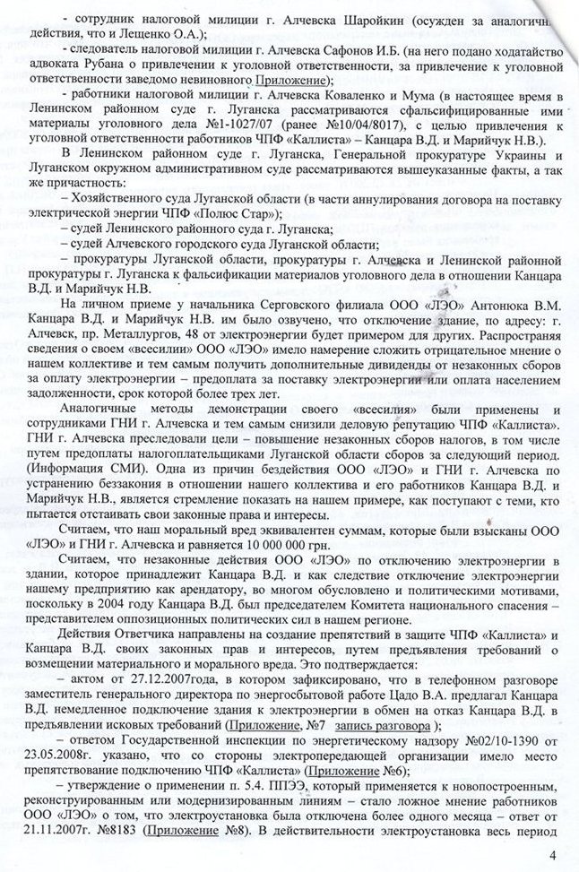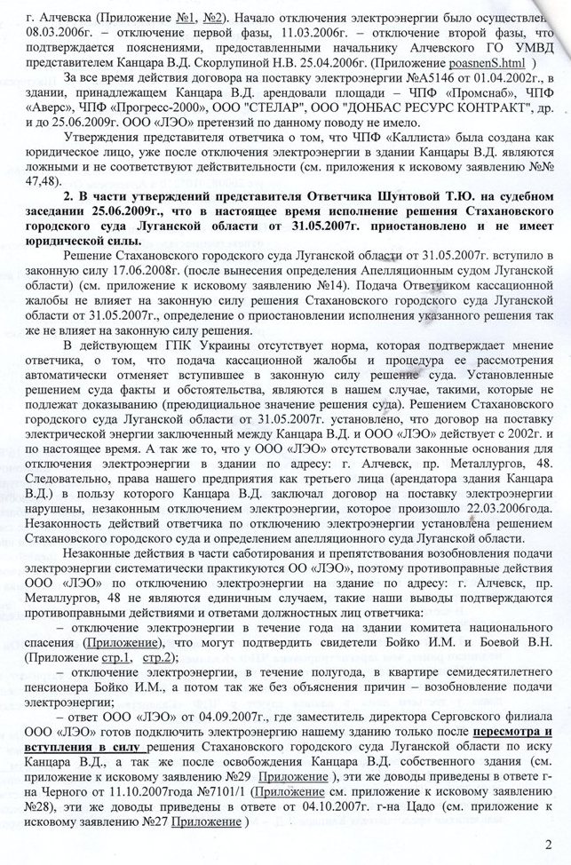 – ответ ООО «ЛЭО» от 04.09.2007г., где заместитель директора Серговского филиала ООО «ЛЭО» готов подключить электроэнергию нашему зданию только после пересмотра и вступления в силу решения Стахановского городского суда Луганской области по иску Канцара В.Д., а так же после освобождения Канцара В.Д. собственного здания (см. приложение к исковому заявлению №29 Приложение ), эти же доводы приведены в ответе г-на Черного от 11.10.2007года №7101/1 (Приложение см. приложение к исковому заявлению №28), эти же доводы приведены в ответе от 04.10.2007г. г-на Цадо (см. приложение к исковому заявлению №27 Приложение )