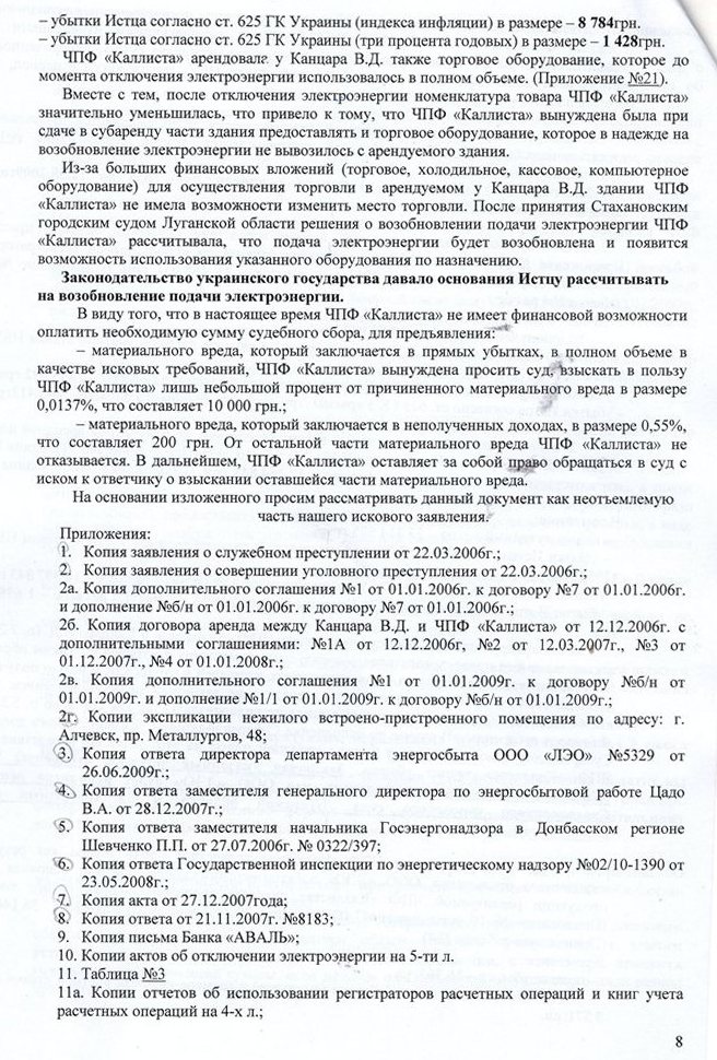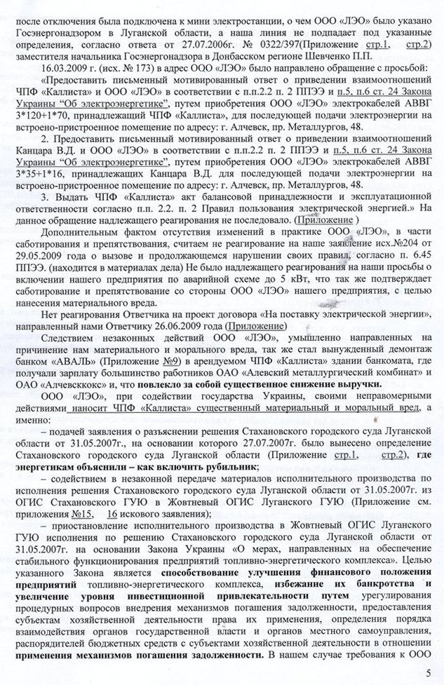 По договору на поставку электроэнергии №А5146 от 01.04.2002г. с ООО «ЛЭО» в эти помещения (здание по адресу: г. Алчевск, пр. Металлургов, 48) Ответчик обязан был поставлять электроэнергию, которая оплачивалась Канцара В.Д. по тарифам для предприятий. Правоотношения аренды между Канцара В.Д. и ЧПФ «Каллиста» возникли с 01.01.2006г., (Приложение №2а, 2б, 2в) при этом Ответчик нарушил свои обязательства по договору и окончательно отключил электроэнергию с 22.03.2006г., что подтверждается заявлениями представителя Канцара В.Д. – Марийчук Н.В. в Алчевский ГОВД и прокуратуру г. Алчевска (Приложение №1, №2). Начало отключения электроэнергии было осуществлено 08.03.2006г. – отключение первой фазы, 11.03.2006г. – отключение второй фазы, что подтверждается пояснениями, предоставленными начальнику Алчевского ГО УМВД представителем Канцара В.Д. Скорлупиной Н.В. 25.04.2006г. (Приложение poasnenS.html )