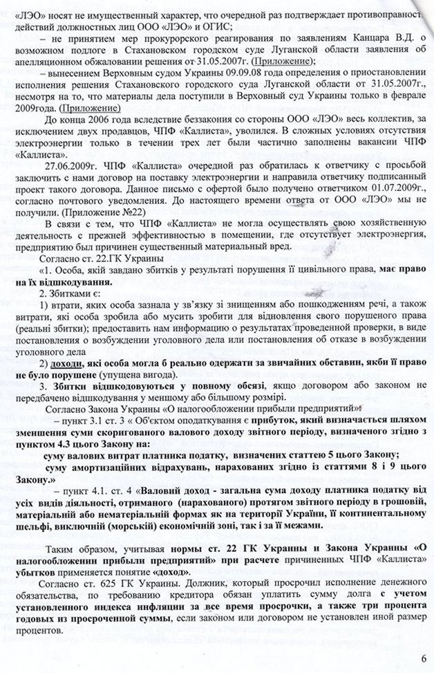 – ответ от 28.12.2007г. заместителя генерального директора по энергосбытовой работе Цадо В.А. – на стр.4 признает действующим договор, заключенный между Канцара В.Д. и ООО «ЛЭО» от 01.04.2002г. №5146, но незаконно требует для подачи электроэнергии исполнения пунктов ППЭЭ (Приложение №4 стр.1, стр.2, стр.3, стр.4). Указанные требования были опровергнуты ответом от 27.07.2006г. № 0322/397 (Приложение №5 стр.1, стр.2), (958 Страница no.29, 30) заместителя начальника Госэнергонадзора в Донбасском регионе Шевченко П.П. – где указано, что это не новопостроенная, реконструированная или модернизированная линия и поэтому требования ООО «ЛЭО» к нам не применимо и следовательно, действия поставщика в отношении нас неправомерны. Далее было сказано о других нарушениях поставщика и о выдаче предписания о немедленном включении электроэнергии.