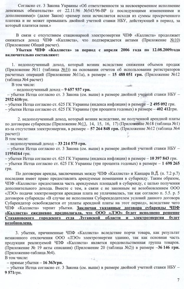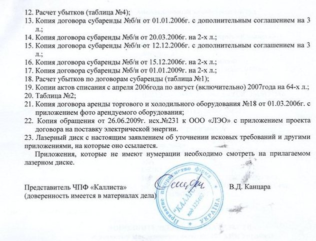 Из-за больших финансовых вложений (торговое, холодильное, кассовое, компьютерное оборудование) для осуществления торговли в арендуемом у Канцара В.Д. здании ЧПФ «Каллиста» не имела возможности изменить место торговли. После принятия Стахановским городским судом Луганской области решения о возобновлении подачи электроэнергии ЧПФ «Каллиста» рассчитывала, что подача электроэнергии будет возобновлена и появится возможность использования указанного оборудования по назначению.
