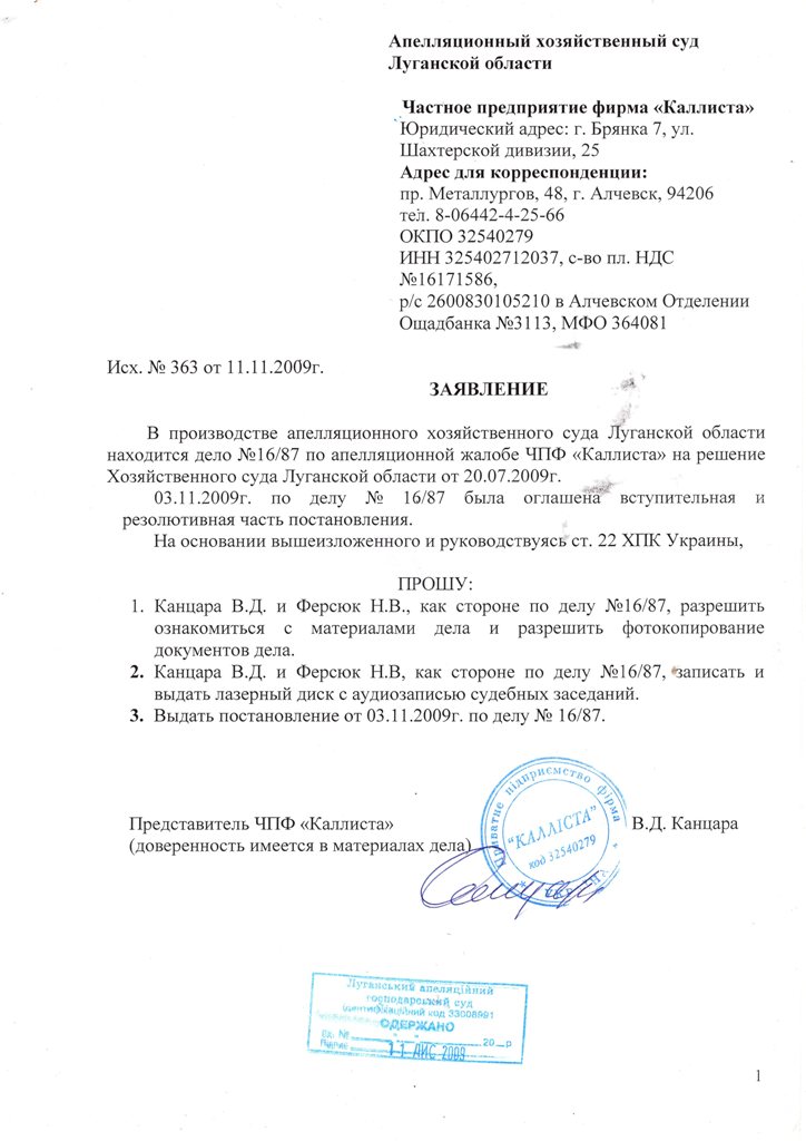В производстве апелляционного хозяйственного суда Луганской области находится дело №16/87 по апелляционной жалобе ЧПФ «Каллиста» на решение Хозяйственного суда Луганской области от 20.07.2009г.